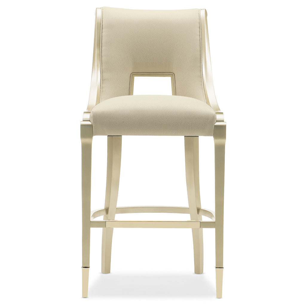 Destined to elevate a room, this clean-lined bar stool is the perfect mate to a stylish bar-height table or island. Completely upholstered in a creamy elegant fabric, it features a unique seat design with a cut-out outlined in Allusion Gold. Shapely supportive legs taper to metal ferrules in a Whisper of Gold finish and are matched with a bold stretcher in the same metallic.