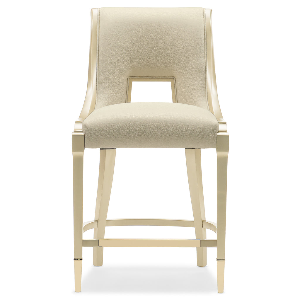 The perfect mate to today’s most stylish kitchen islands, this clean-lined counter stool is dreamy from every angle. Completely upholstered in a creamy elegant fabric, it features a unique seat cut-out outlined in Gold Bullion Paint. Shapely supportive legs taper to metal ferrules in a Whisper of Gold finish and are matched with a bold stretcher in the same metallic.