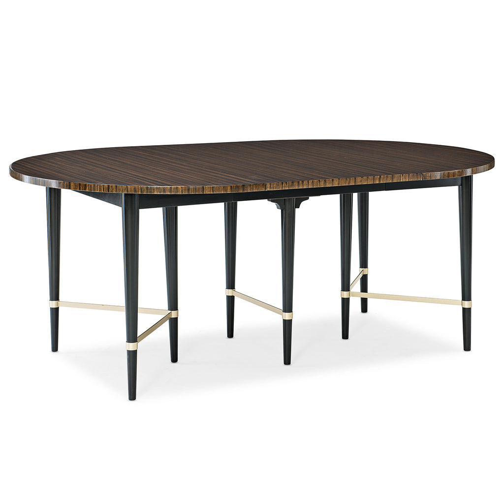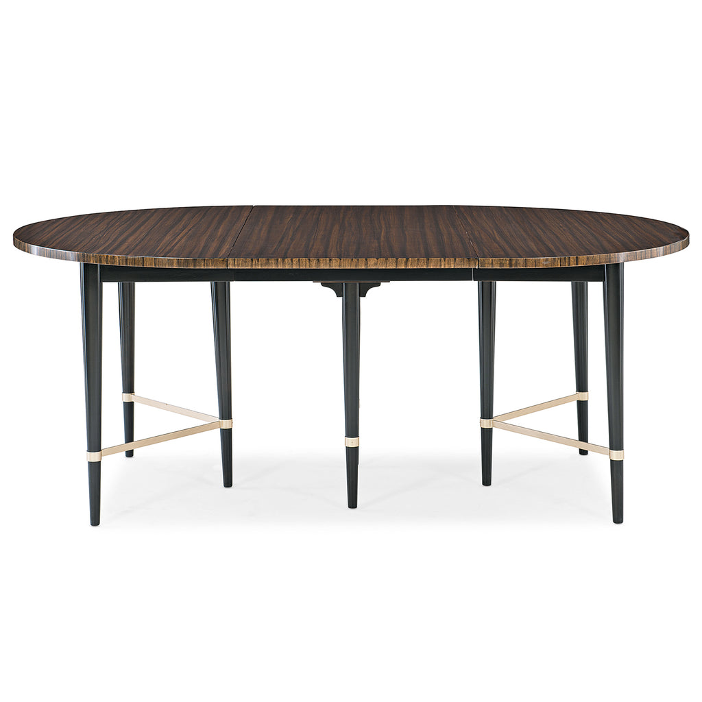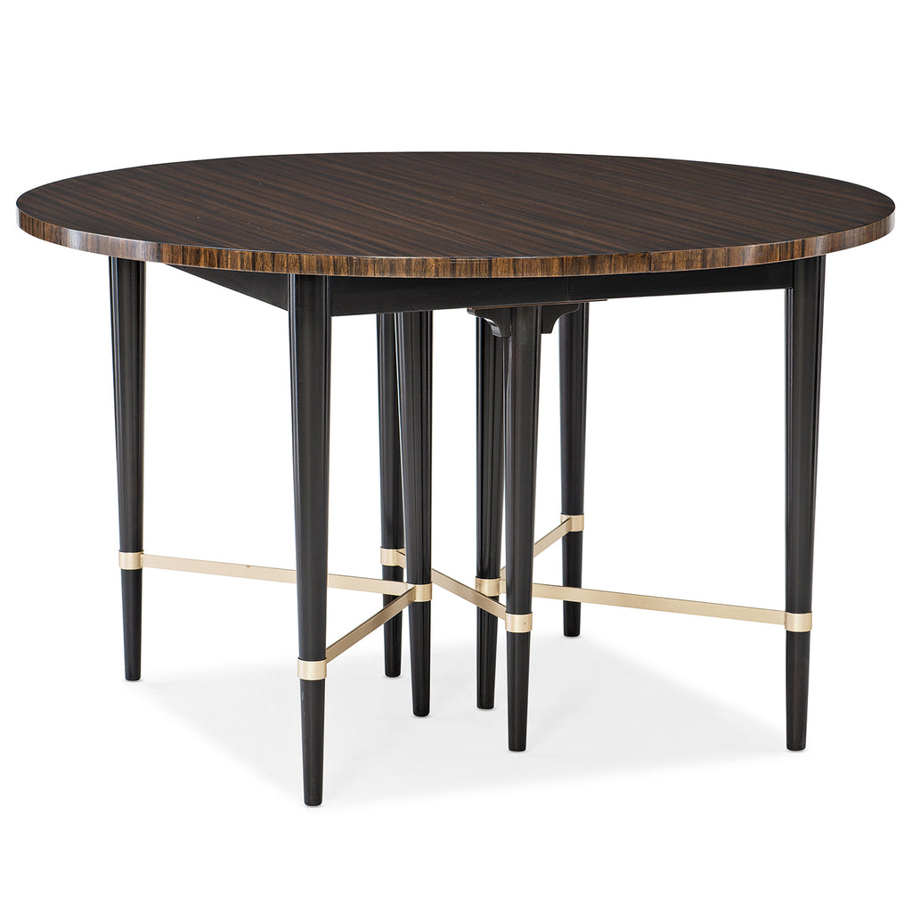 Set a stylish scene with the bold character of this statement-making dining table. Its perfect proportions offer urban scaling in a contemporized traditional design. Stunning quartered Paldao wood distinguishes the tabletop and is finished in a rich shade of Saddle. A deep Black Saddle finish adds depth to its legs and apron while a Neutral Metallic highlights the stretchers. Its 48-inch design is easily extended to 72 inches with its 24-inch leaf so you can accommodate even more guests.