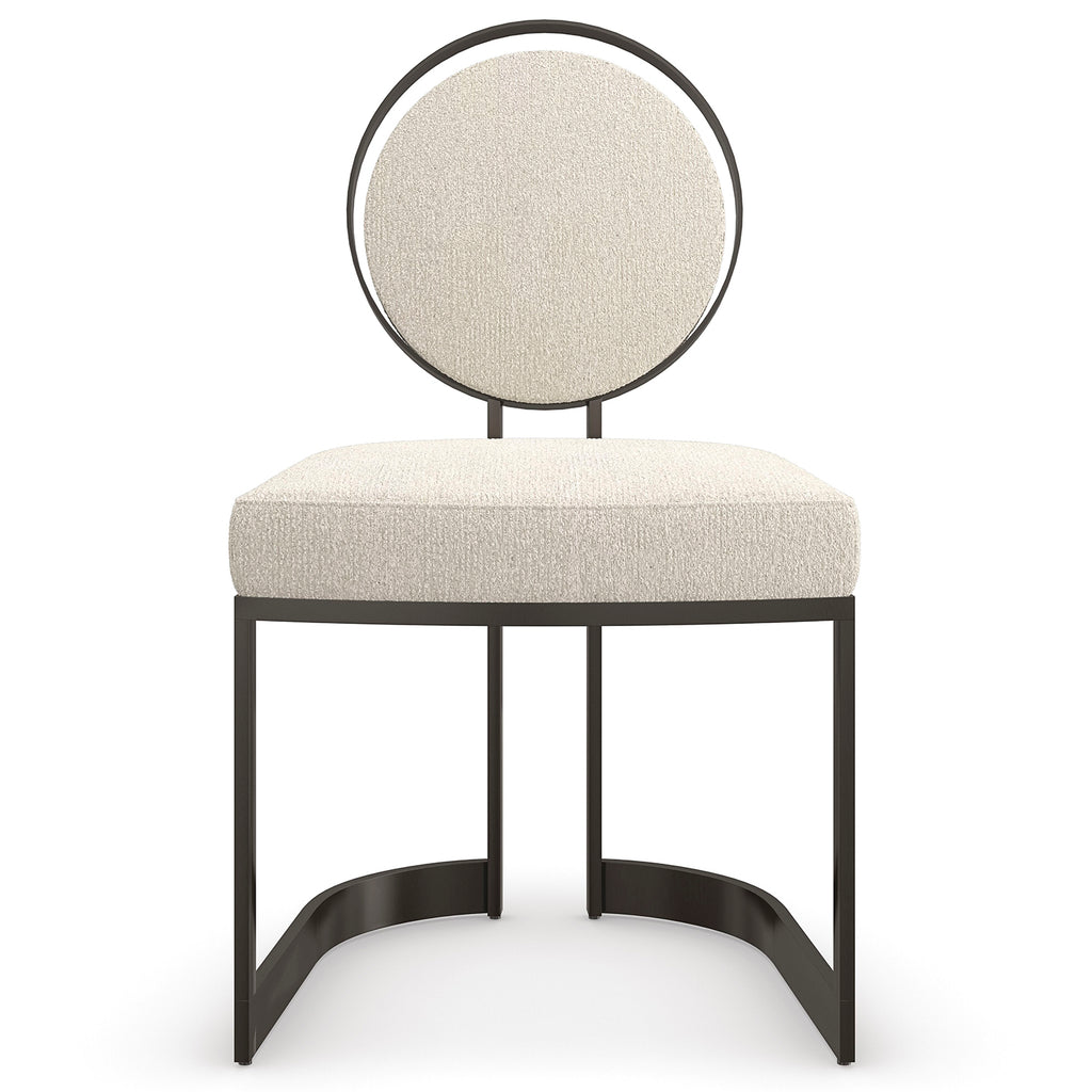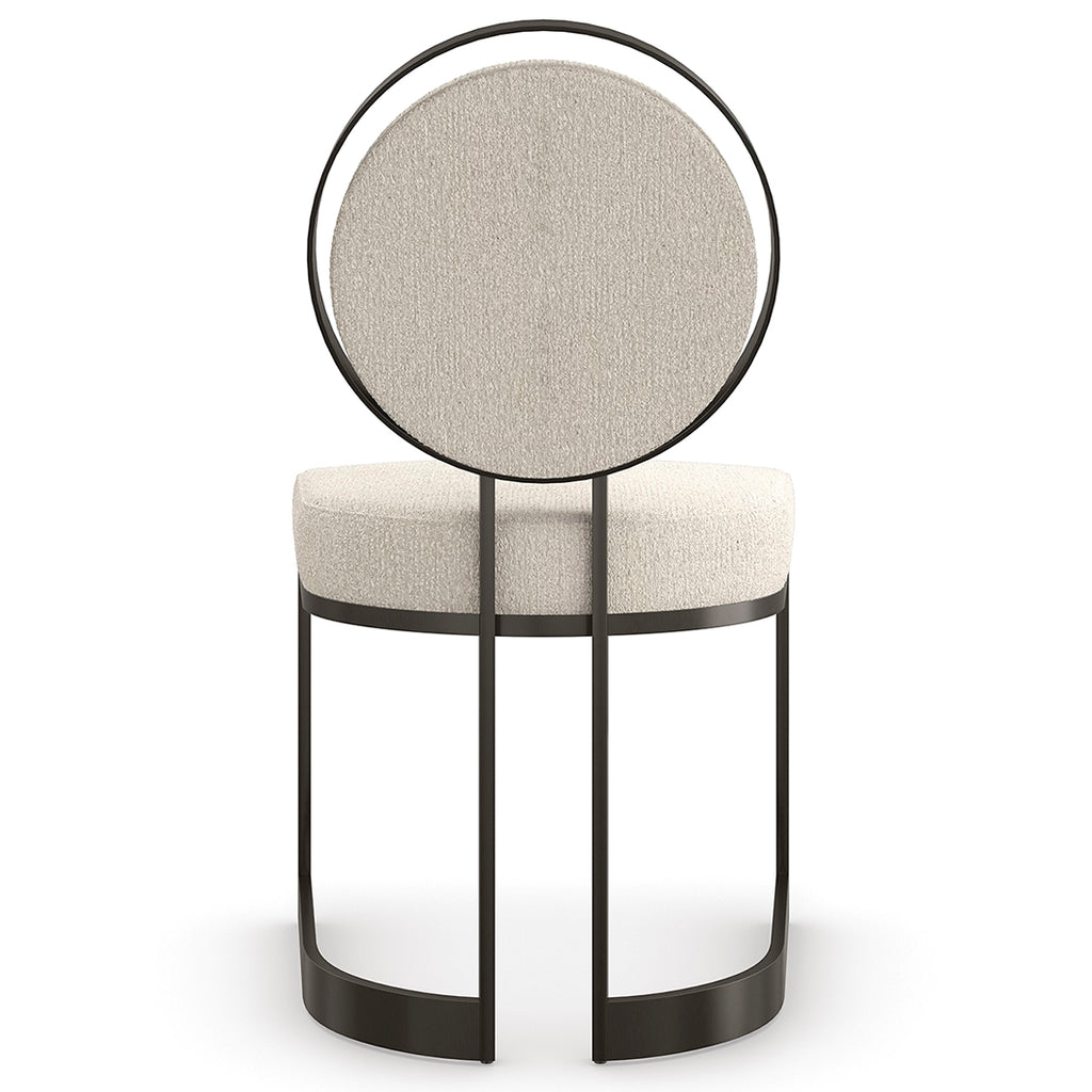 This sculptural metal chair lends an artful element to dining interiors, with a seemingly floating upholstered back set inside a metal circle. A sliver of space around the edges evokes phases of the moon and mimics its crescent-shaped frame. A tactile ivory fabric is welcoming to the senses and in dramatic contrast to a rich, Chocolate Bronze finish.