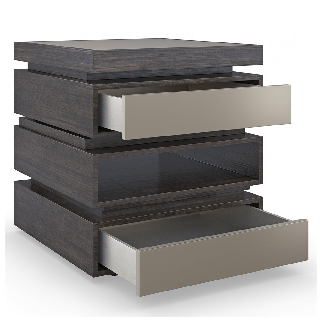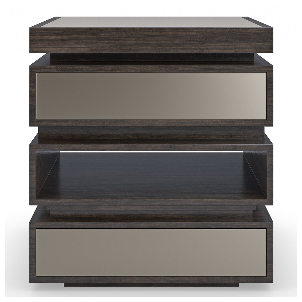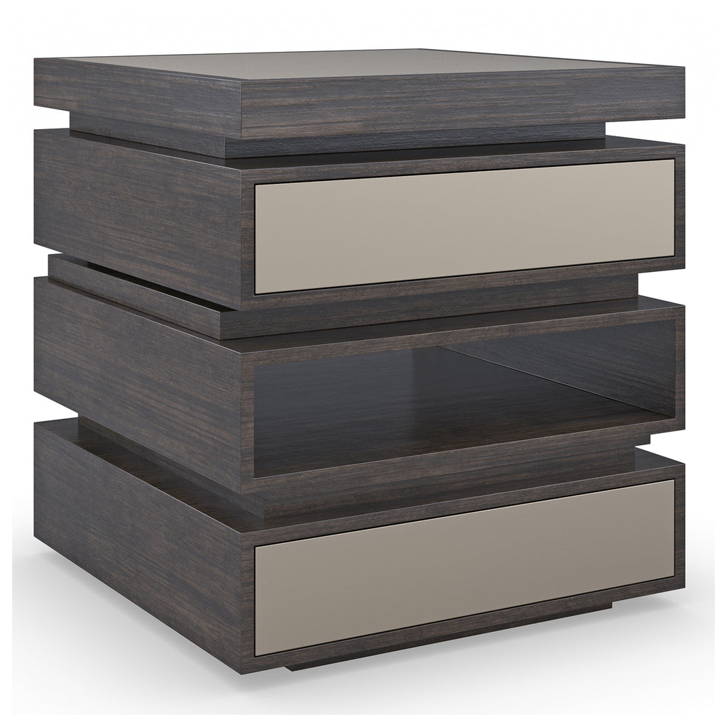 Elevating principles of design and architecture, this tiered end table makes a solid statement with stacked cubes in a mix of materials and finishes. An inset, frosted bronze glass top adds a sturdy surface, while bronze mirror drawers add to its allure. Features open center storage for displaying books and objects.