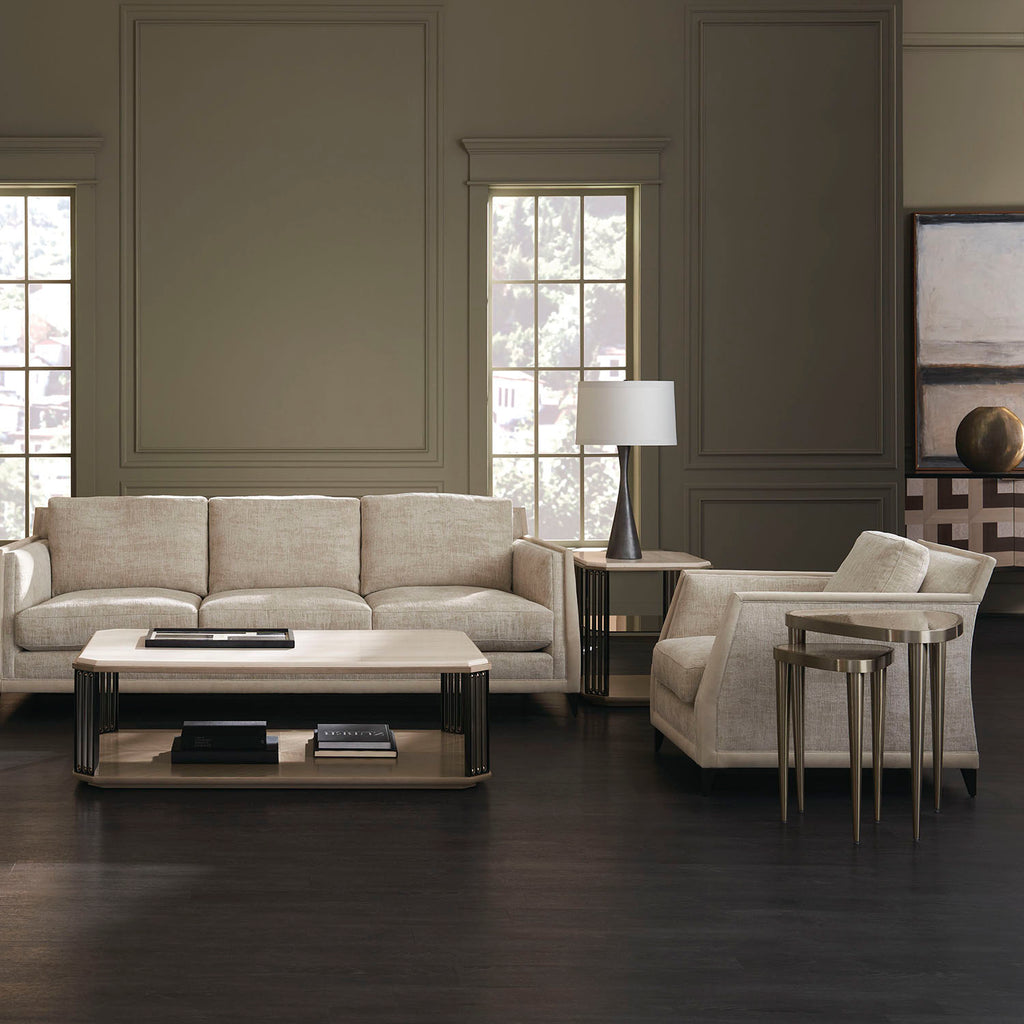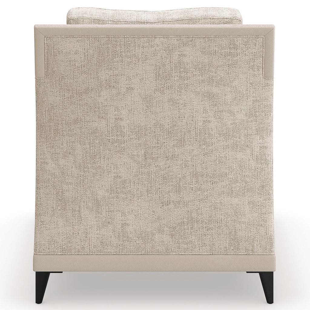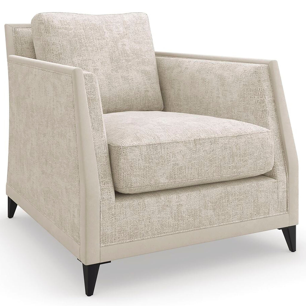 Meticulously tailored yet beautifully worn in a distressed chenille fabric, this versatile chair introduces a classic silhouette with Art Deco influences. Accentuating subtly angles and a sophisticated profile, a micro suede border lends tonal contrast and texture, warmly complemented by tapered feet in a Brushed Deep Bronze metal.