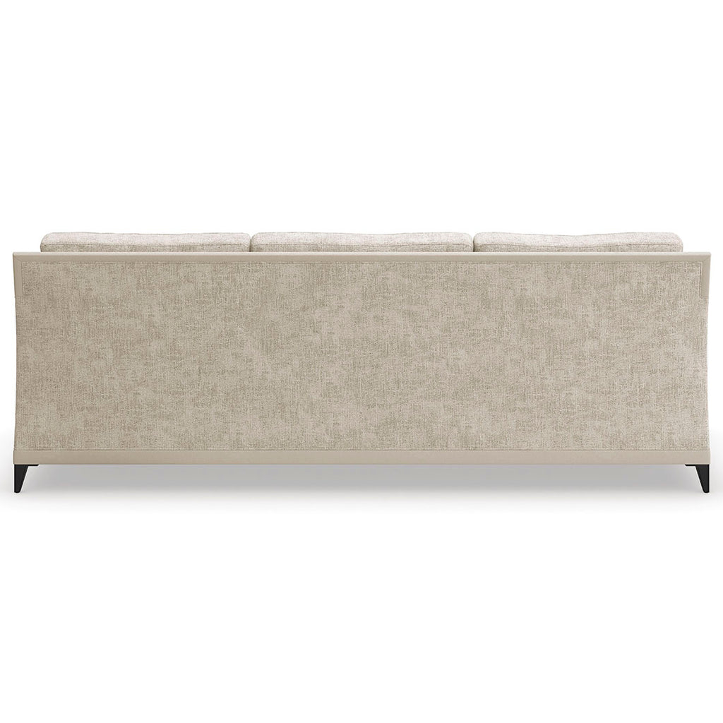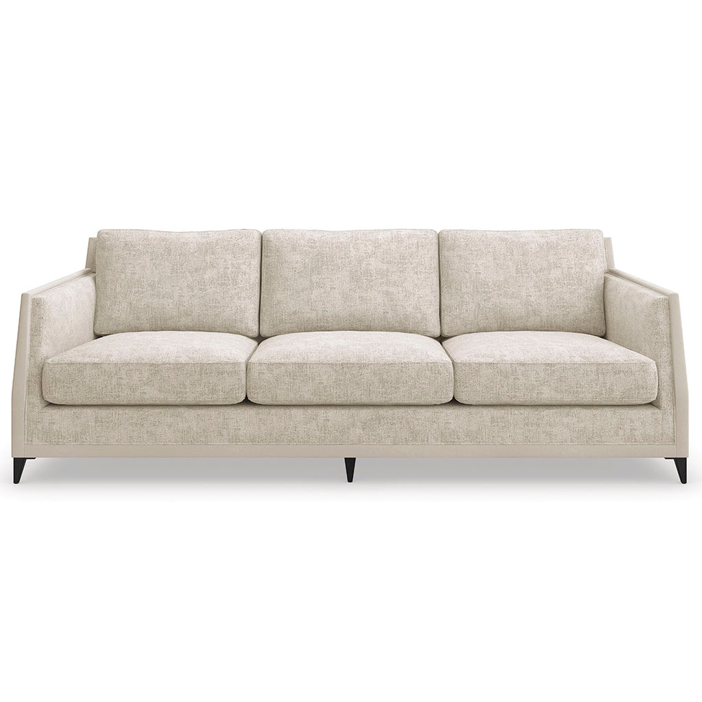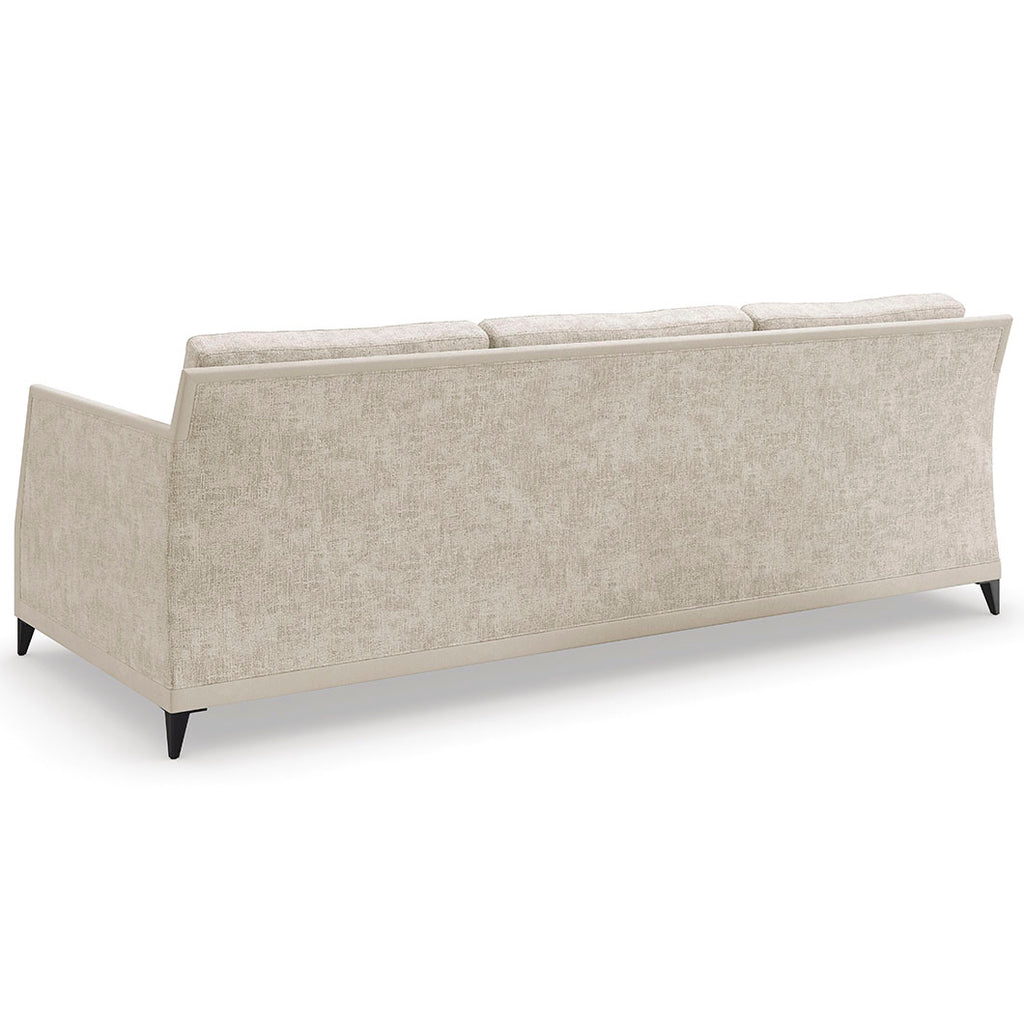 A classic silhouette with Art Deco influences, this versatile sofa introduces a crisply tailored yet beautifully worn aesthetic in a distressed chenille fabric. Accentuating subtly angles and a sophisticated profile, a micro suede border lends tonal contrast and texture, warmly complemented by tapered feet in a Brushed Deep Bronze metal.