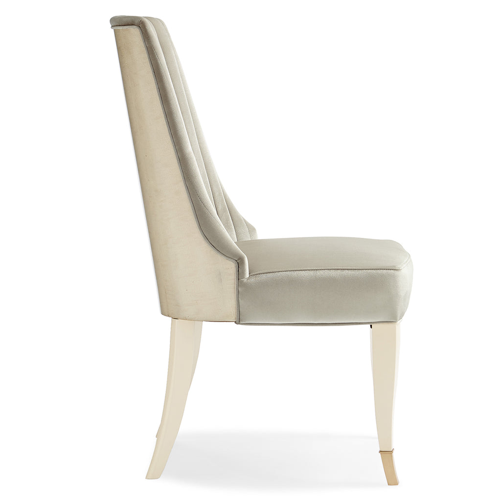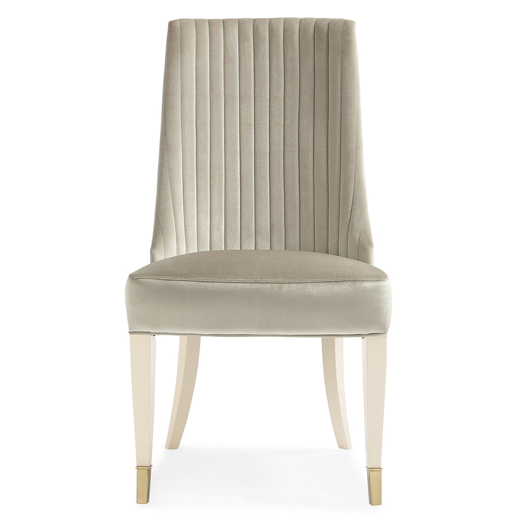 Quite possibly the perfect dining chair, this graceful silhouettel features a shapely exterior crafted of mottled Anegre veneers and finished in a graceful Platinum Blonde finish. Comfortable yet confident, its elegantly tailored seat and inside back are upholstered in a luxurious neutral fabric that exudes glamour. Fashionable legs complete the ensemble and wear an Ivory Painted finish accented with metal ferrules in Champagne Gold.
