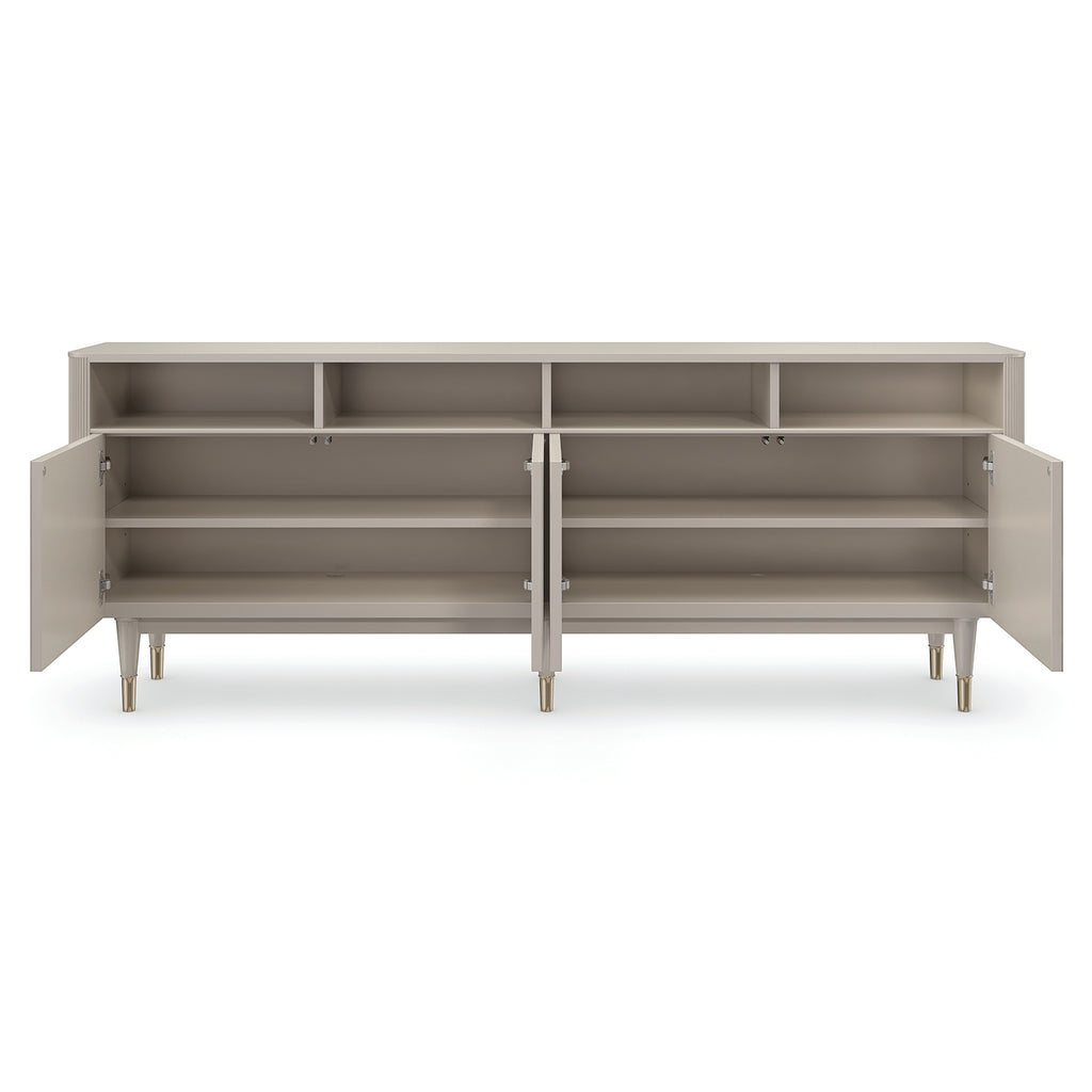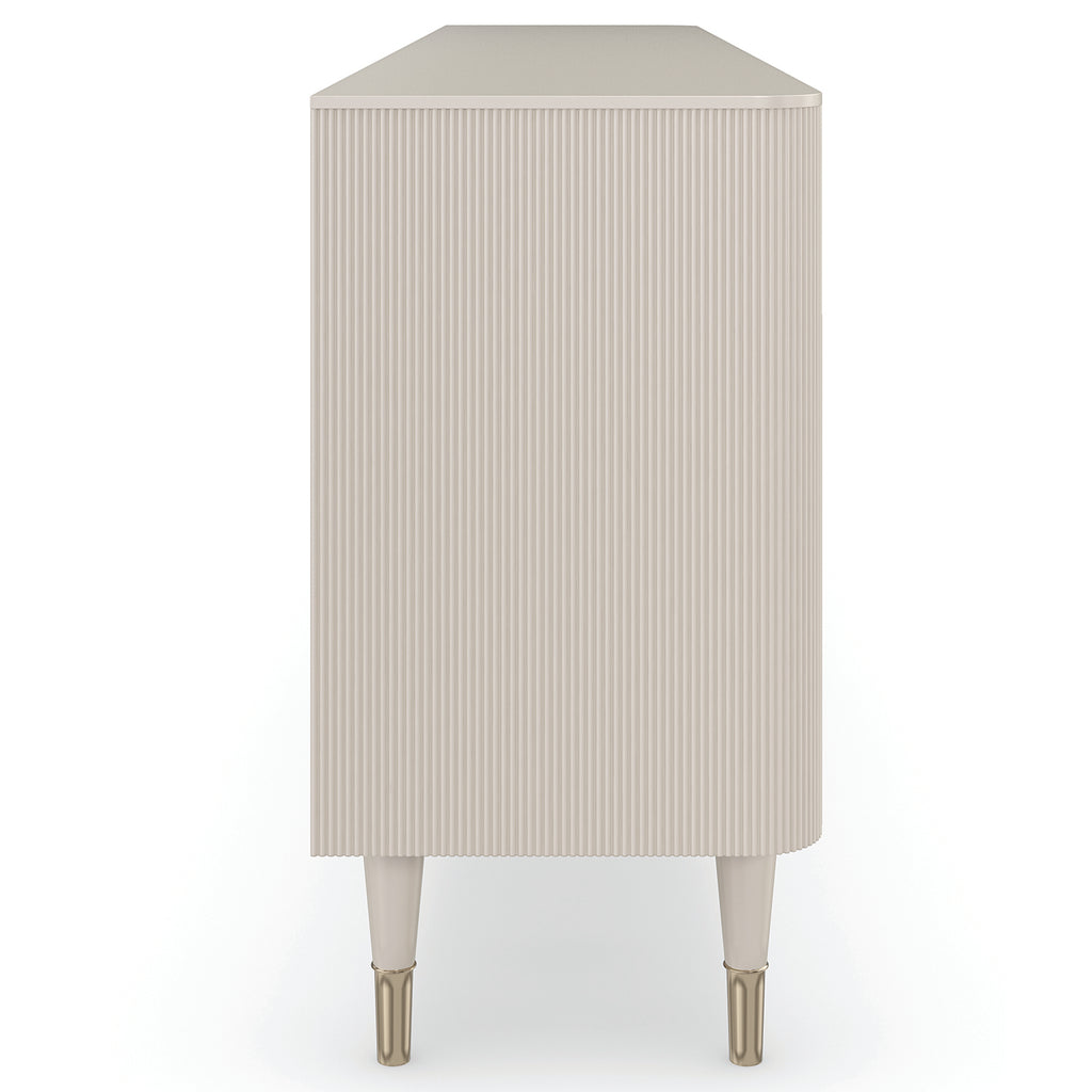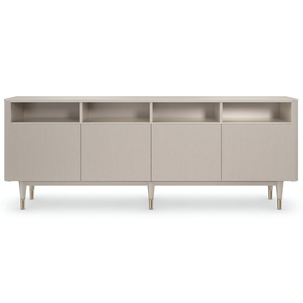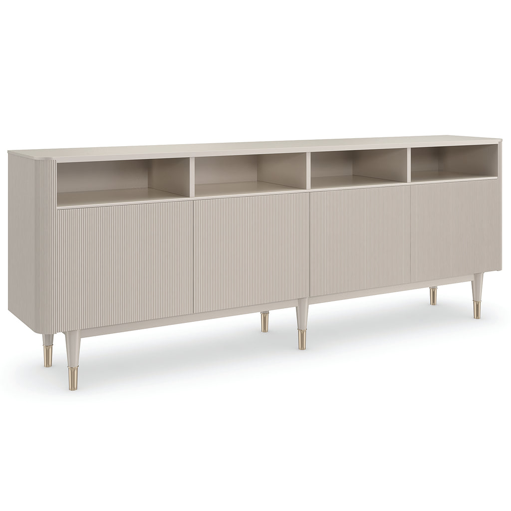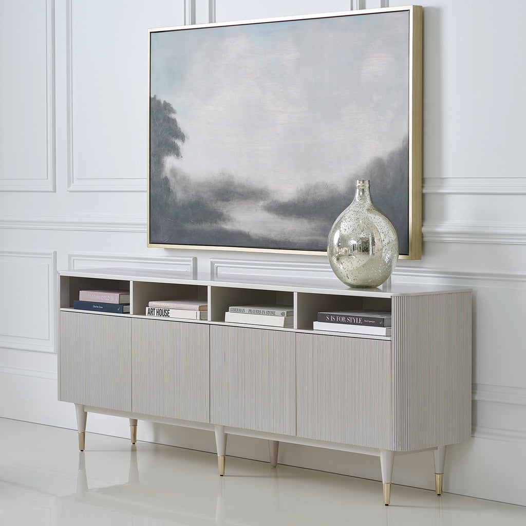 Tactile reeded door fronts in a Matte Peal finish emphasize this linear design, with a modern-yet-elegant aesthetic that blends with entryways, living or dining interiors. Open cubby spaces offer easily accessible storage above four, touch-latch doors, neatly concealing a Matte Pearl-painted interior with adjustable shelves and cutouts along the back for cord management.