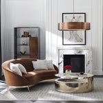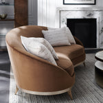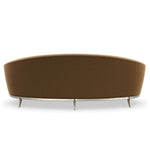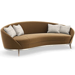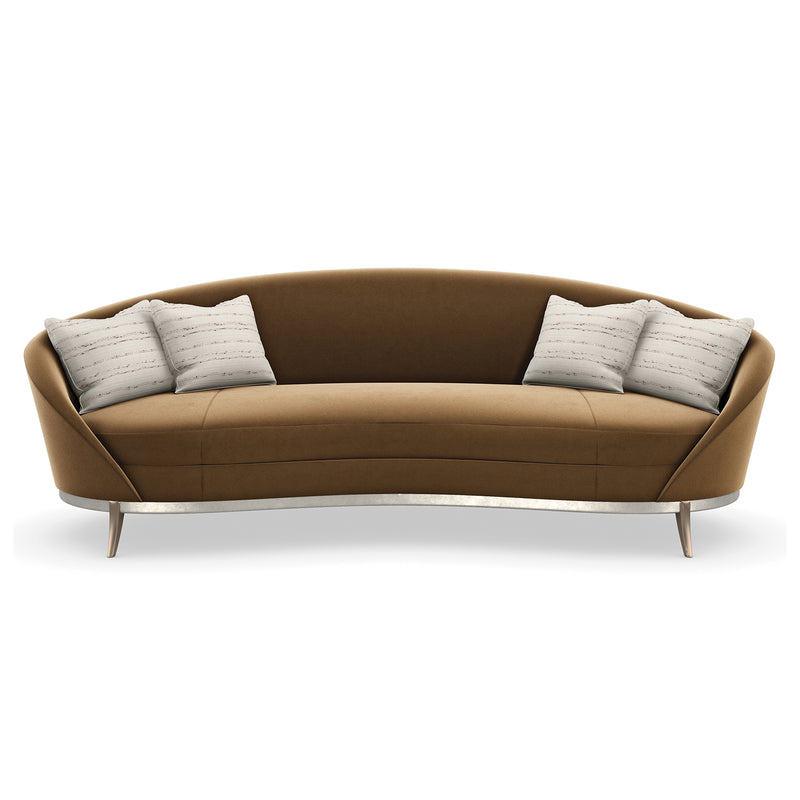 With an iconic kidney shape, this sumptuous sofa offers enveloping comfort in a warm caramel-colored velvet. Its gracefully flowing form features a smooth back and bowed bench seat, with French seams for a distinctive accent. Bronze sabre-style legs elevate its curved wood base, finished in Duty Silver for a touch of luxe. Toss pillows in a shimmering cut velvet add a painterly stripe and pop of contrast.