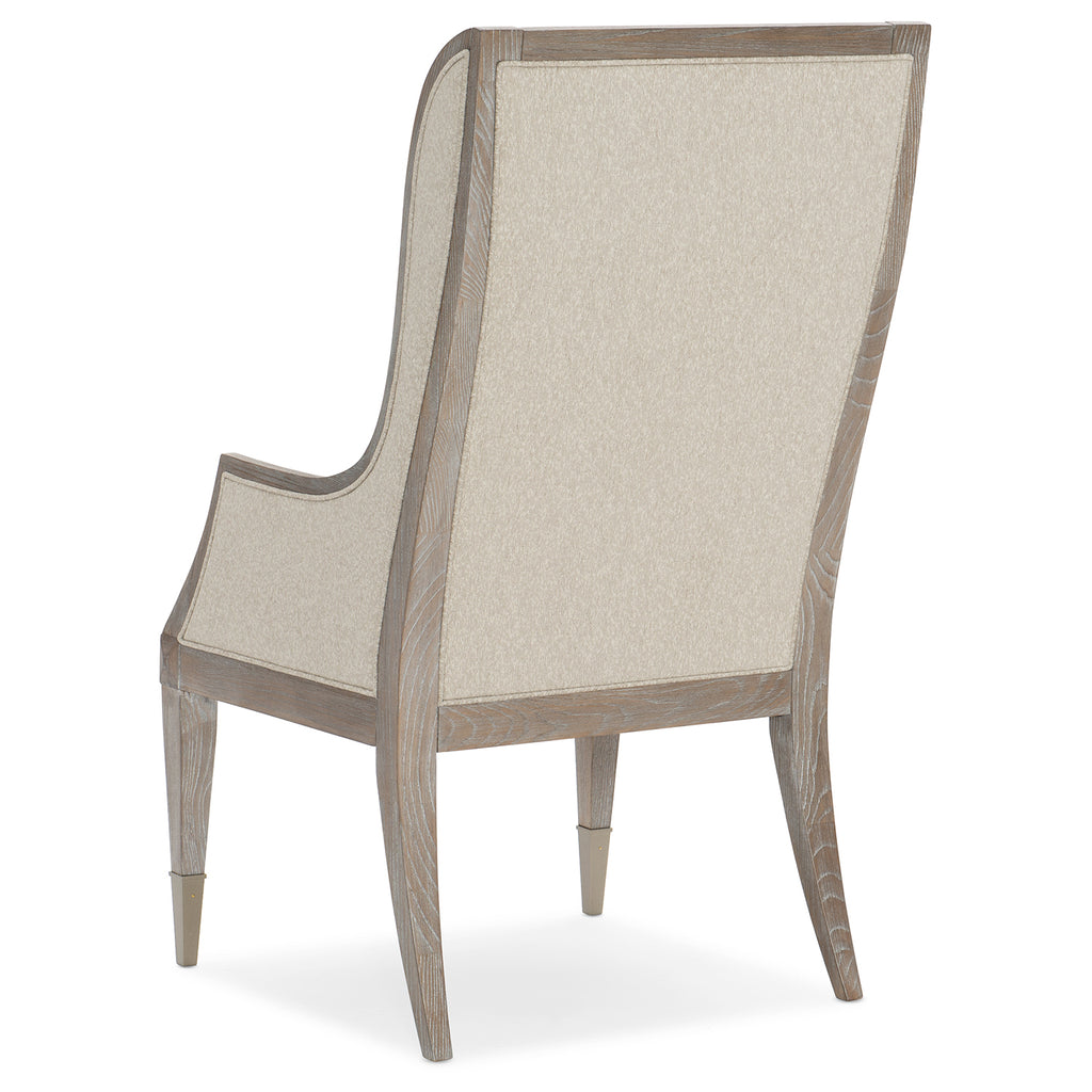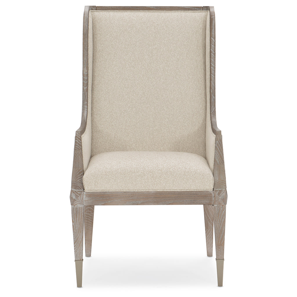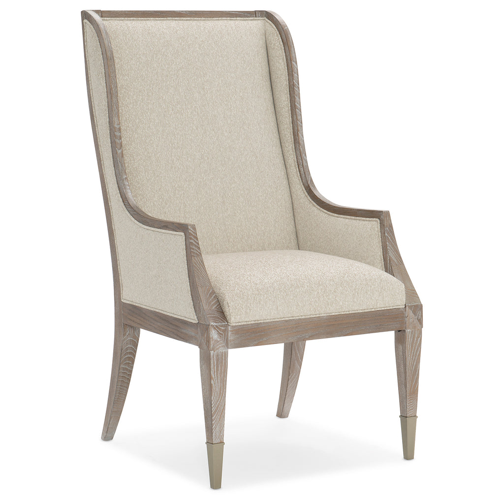 A handsome addition at any table, the Open Arms Arm Chair elevates every dining experience. Its timeless silhouette is brought to life in a casually elegant Ash Driftwood finish and complemented with a finely tailored, luxe fabric cover in an elegant neutral shade. Easygoing at heart, the fine lines of this fully upholstered chair render it perfect for the host and hostess. Metal ferrules in Sundance Gold cap each front leg for a touch of bling.