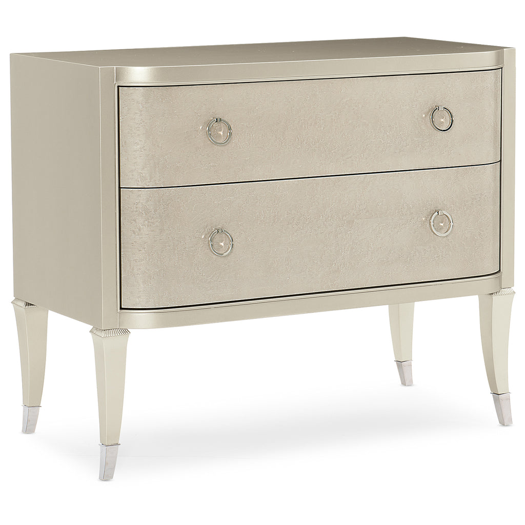 With effortless elegance, this sophisticated nightstand makes the perfect mate for any stylish bed. Designed to keep nighttime essentials close at hand, it wears a Soft Silver Paint finish and offers two drawers with painted interiors in the same soothing hue. Each drawer face is accentuated by an exquisite Smoked Birdseye finish complemented by shimmering, jewelry-like ring pulls while metal ferrules in Polished Stainless Steel cap its gently curved legs.