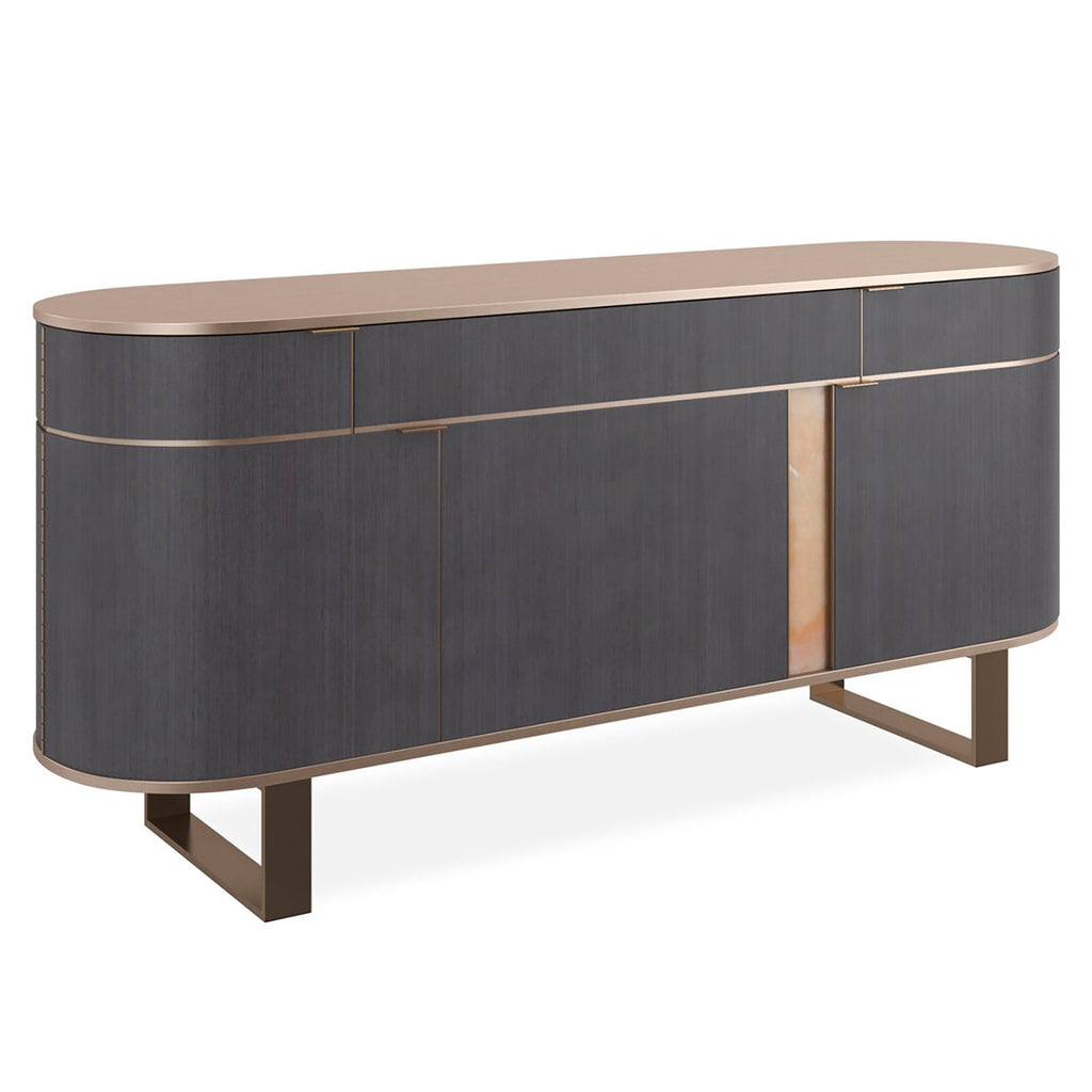 Harkening to Mondrian’s colorful squares and rectangles outlined in black, this piece uses Zinc-pained Asian hardwoods trimmed in Brushed Gold paint to create an abstract statement for any dining or living room. Three drawers are brushed in Zinc, trimmed in Brushed Gold Paint and finished with Brushed Gold metal pulls. Three slightly offset touch-latch doors follow the same colorways and materials. Further mixing the shapes on the piece, a slat of Orange Onyx stone divides the doors on the right. Each end opens outward – on the right, the drawer opens with the door. There are three adjustable shelves for inside storage. Bronze Gold rectangular see-through metal feet raise the piece dramatically off the floor. Due to the nature of the stone, color may vary from piece to piece.