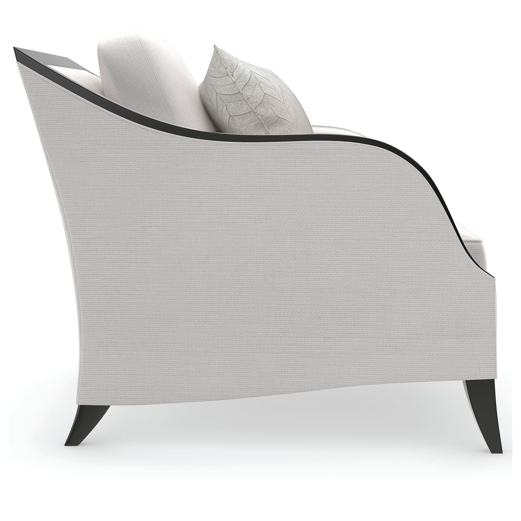 Like our Pitch Perfect sofa, this sleek track arm style is elegantly defined by an exposed wood frame in a richly contrasting, Chocolate Truffle finish. Introduces a classic silhouette, finely tailored in a cream basketweave and accented with a kidney back pillow for added comfort.