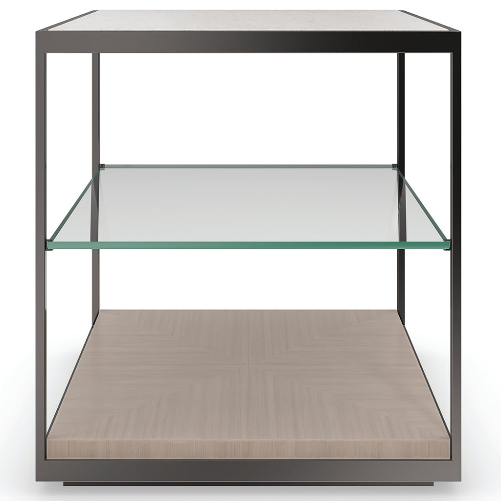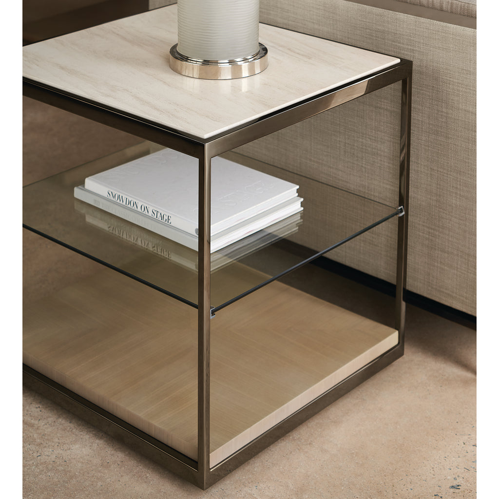 Introduces the same minimalist aesthetic as our Cartesian Cocktail Table, only with a single quadrant of Creme Travertine on top, balanced within a Deep Bronze metal frame. Perfectly scaled to style alongside sofas and chairs, it offers two shelves for open storage and display.