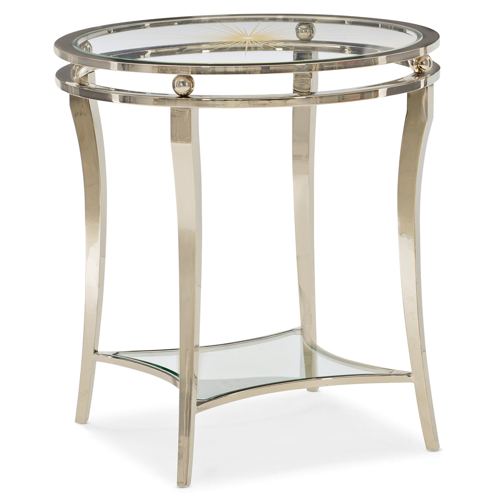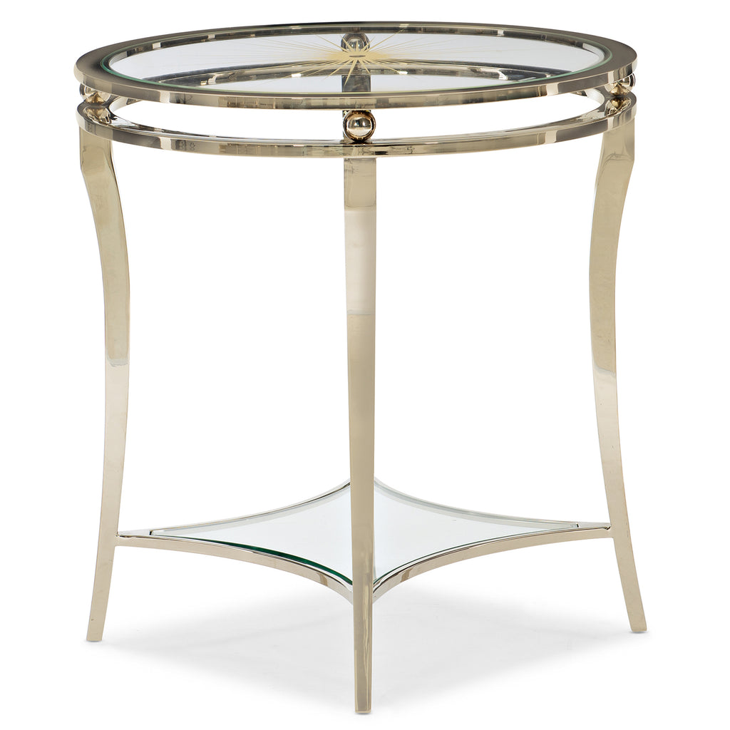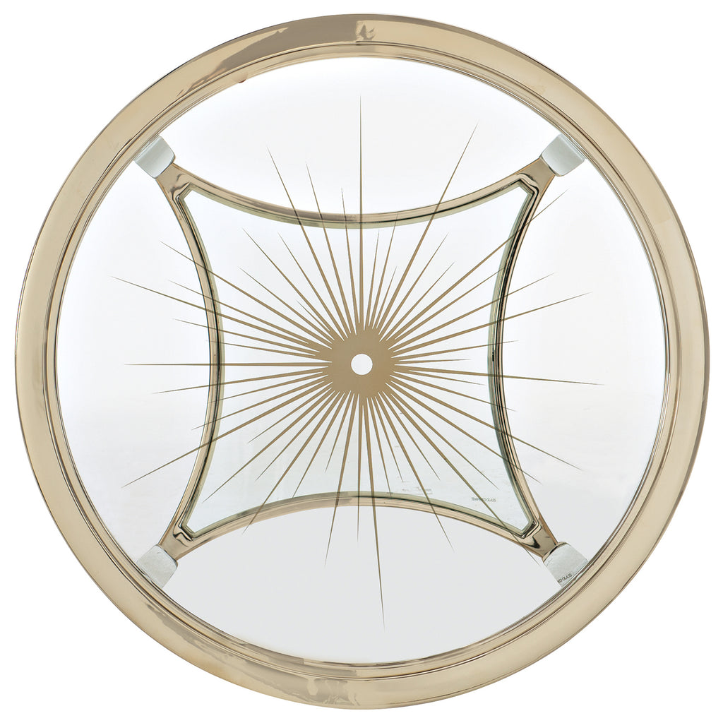 At once classic and chic, this round table is undoubtedly a rising star. A silkscreened starburst pattern in Neutral Metallic highlights its glass top while its metal frame and stretcher shine in a plated Whisper of Gold finish. Like a fine jewel, this stunning piece enhances every interior and is suited to adorn any space. The epitome of classic elegance, it presents a familiar motif modernized with a versatile metallic finish.