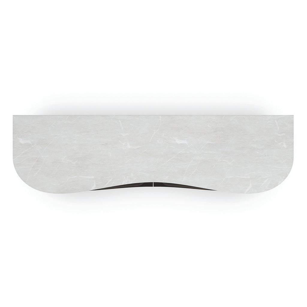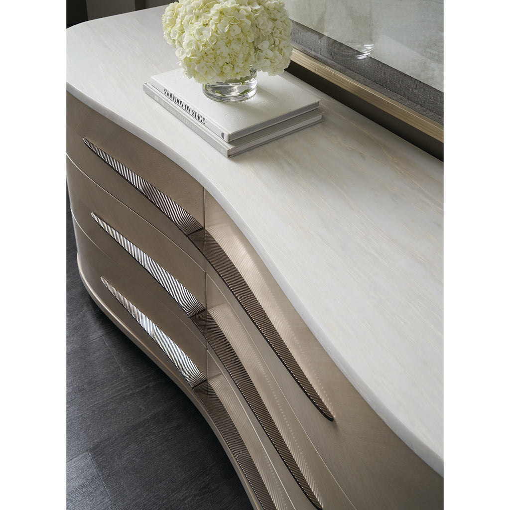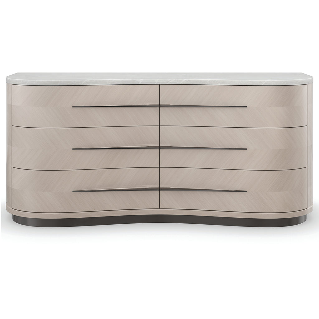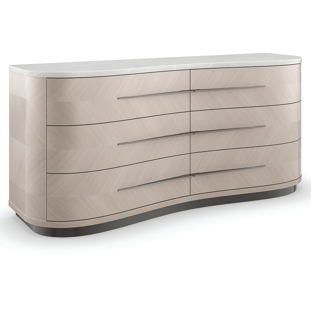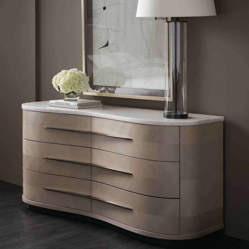 Sleek and sinuous in a pearlescent Moonstone finish, this dresser introduces an elegant form with organic simplicity. Chevron-patterned Koto veneers highlight its fluidity, defined by six gently curving, soft-close drawers with horizontal hardware in a Deep Bronze finish. A White Rhino marble top adds a touch of luxe and durable top surface. With ample potential for style and storage, Roam is a naturally appealing addition to bedrooms and living interiors