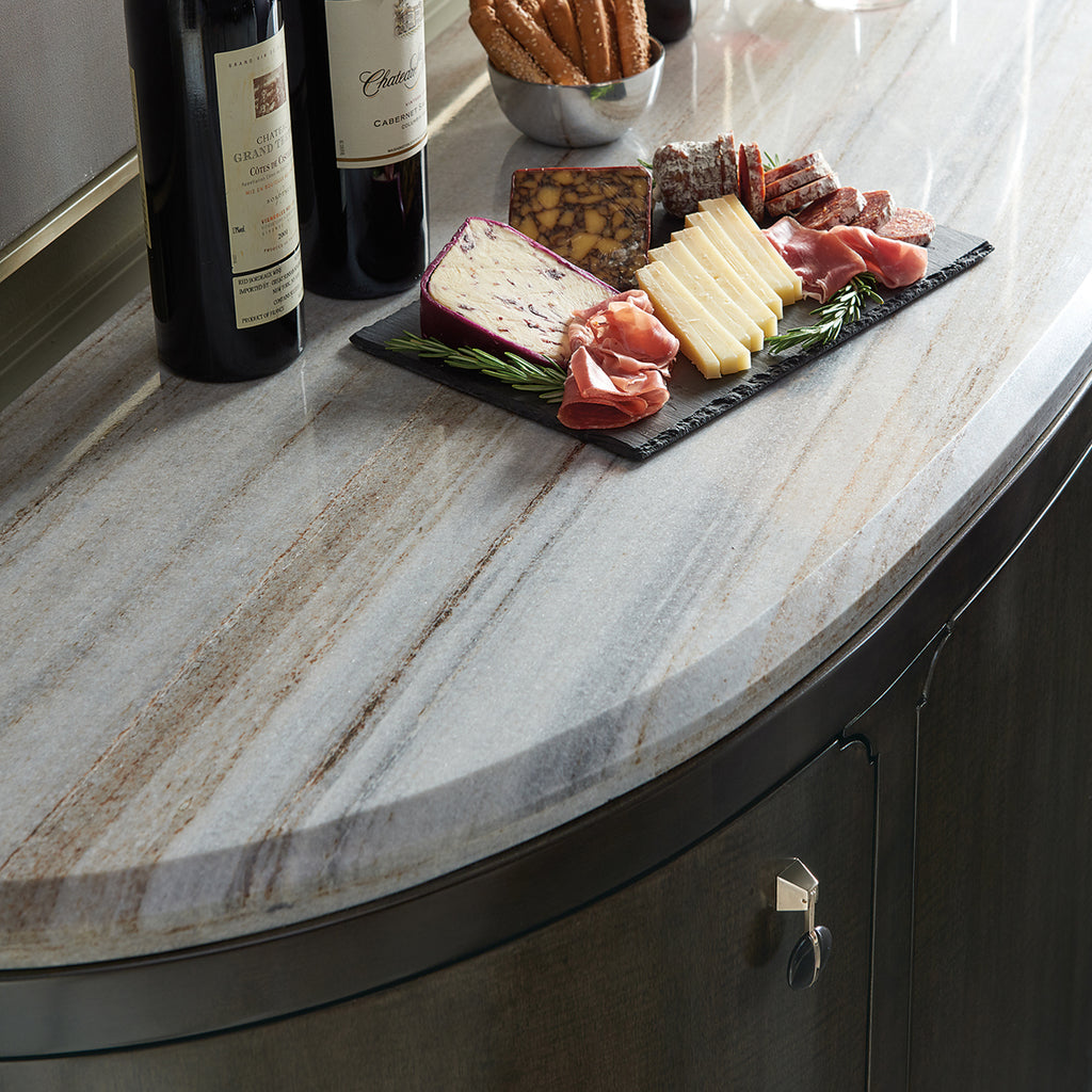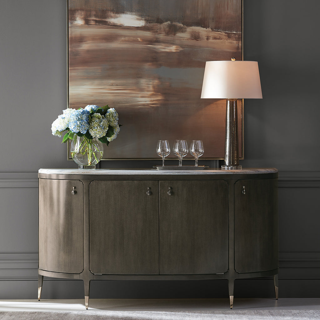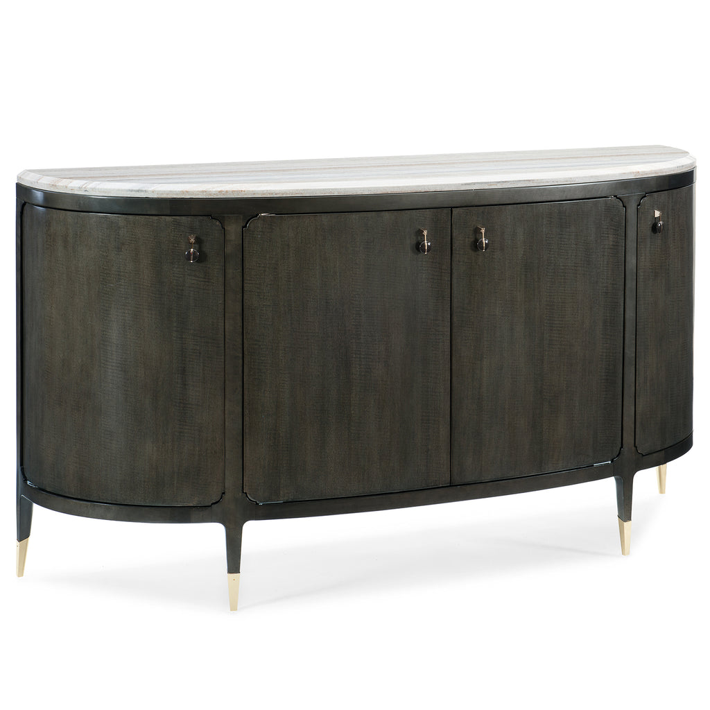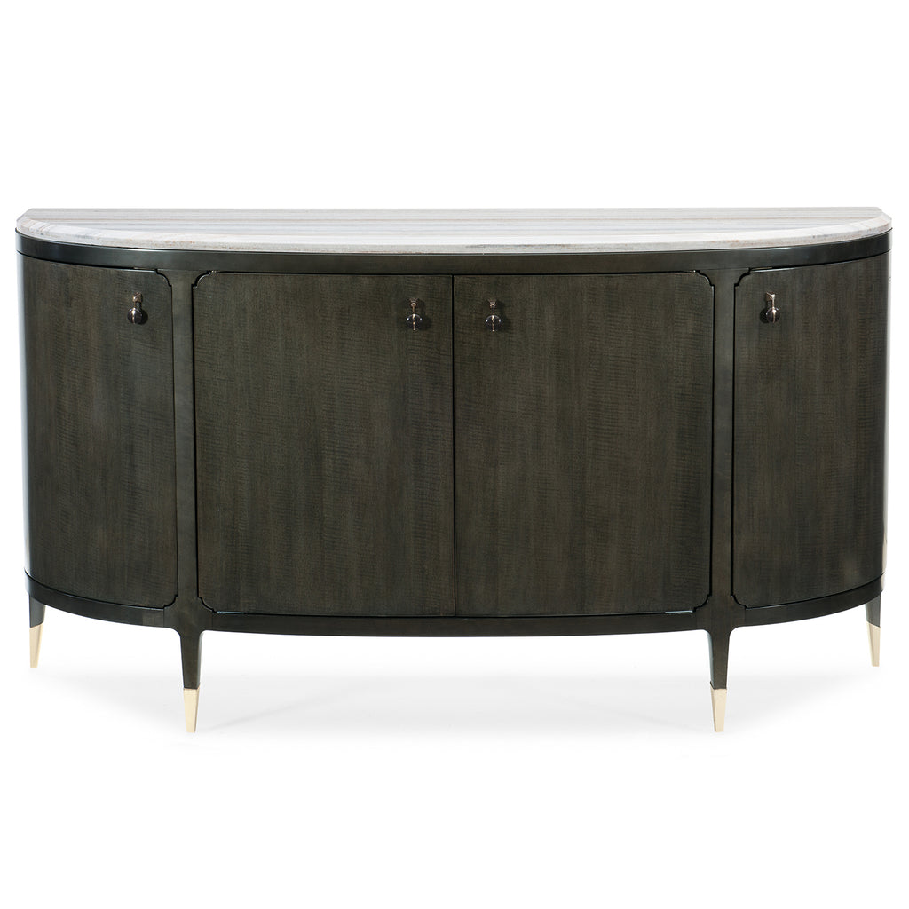 A vision in the beauty of contrast, this fascinating half-moon console wears a dark, Charcoal Anegre finish and a Blue Sandstone top. Each of its four doors is highlighted by jewelry-like pulls and opens to reveal a Seal Skin interior. Inside, a storage drawer and adjustable shelves ensure everything has a place. With dramatic charm, its modern attitude is assured with the addition of metal ferrules in Whisper of Gold. This is just the piece to design a room around.