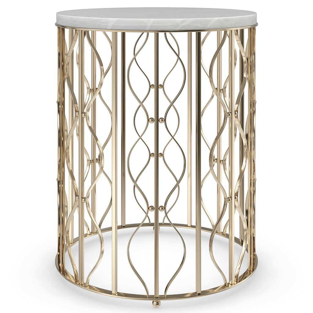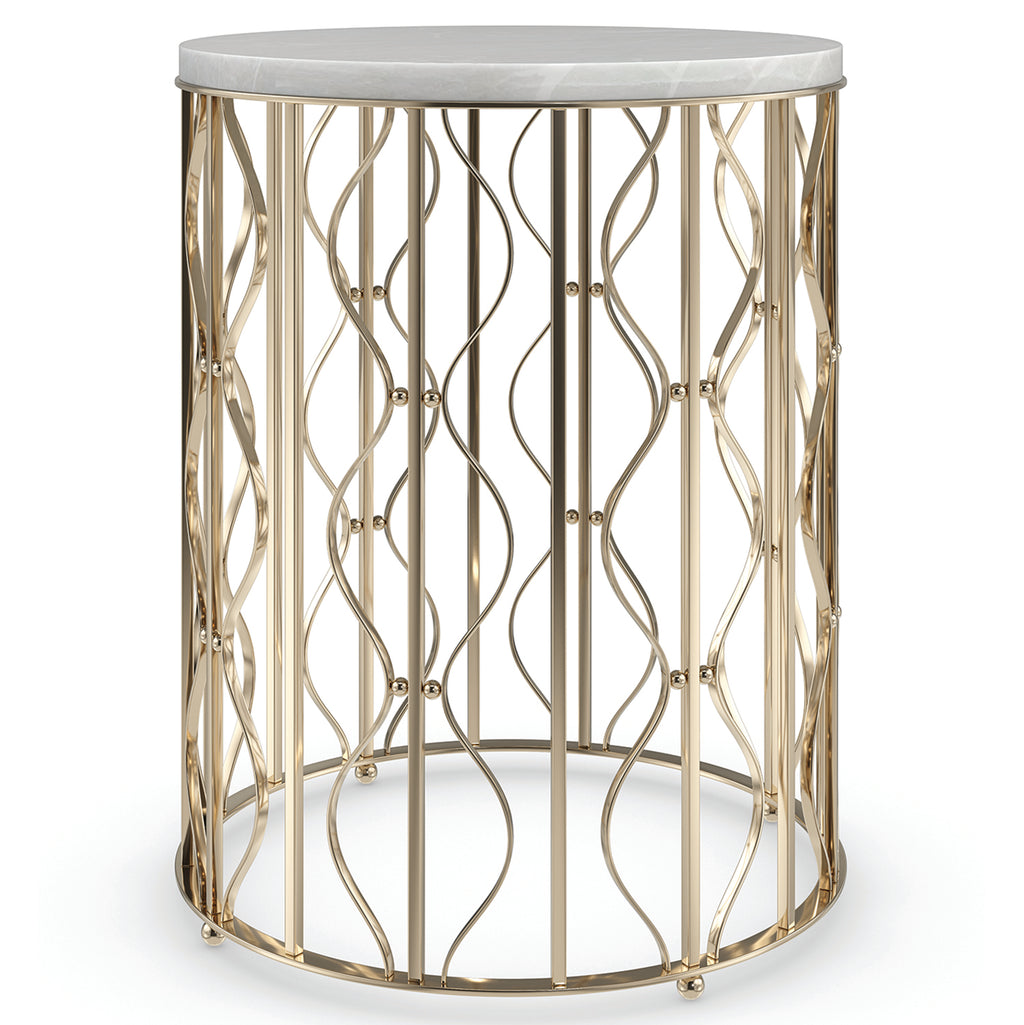 Effervescent and elegant, this accent table captures the tranquil beauty of gently swaying kelp ribbons beneath the waves in a coral reef. A luxurious White Rhino marble top is balanced on its open base, exquisitely crafted with rippling metal bands and pearl-like beads in a Whisper of Gold. Pairs perfectly with our Back in Style sofa and chair.