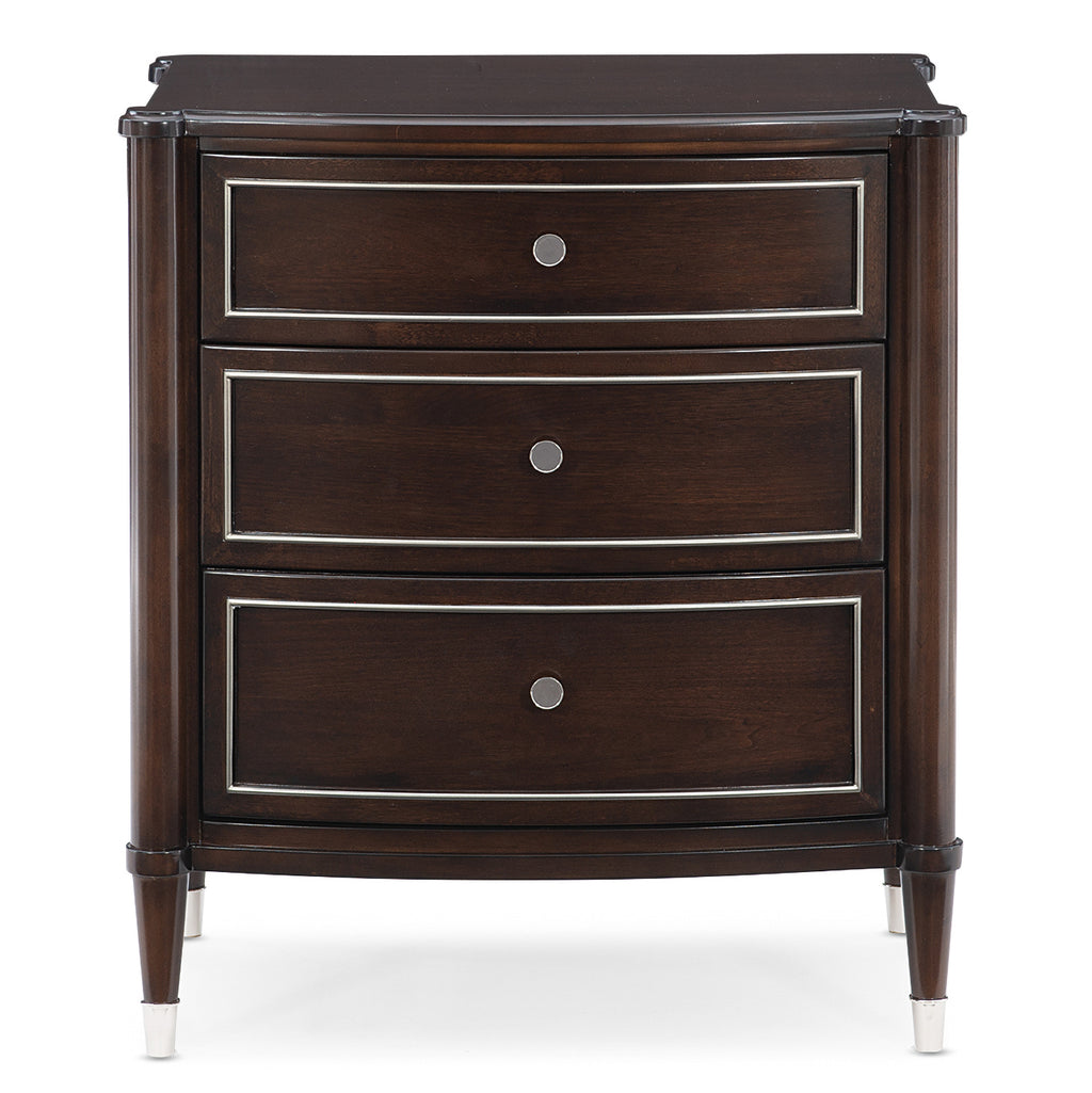 The timeless Mocha Walnut finish and Soft Silver Paint accents of this elegant nightstand are a perfect pairing. Its personality boasts updated traditional heritage enlivened with modern touches. You’re sure to love the storage its three drawers provide—each fully finished in Soft Silver Paint. And for an extra-special touch, its top drawer features a bottom panel silkscreened in a pattern that’s almost too beautiful to cover—certain to bring you joy every time it’s opened.