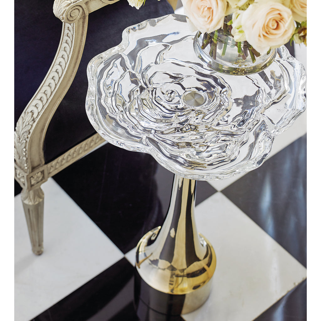 This exquisite cut-crystal accent table is as vibrant as a bouquet in a shimmering gold vase. At 15 inches round, you can peer through the ultra-clear top to see each delicate rose petal come to life in three-dimensional crystal splendor. The fluted metallic Majestic Gold base ensures a design with a truly rosy perspective.