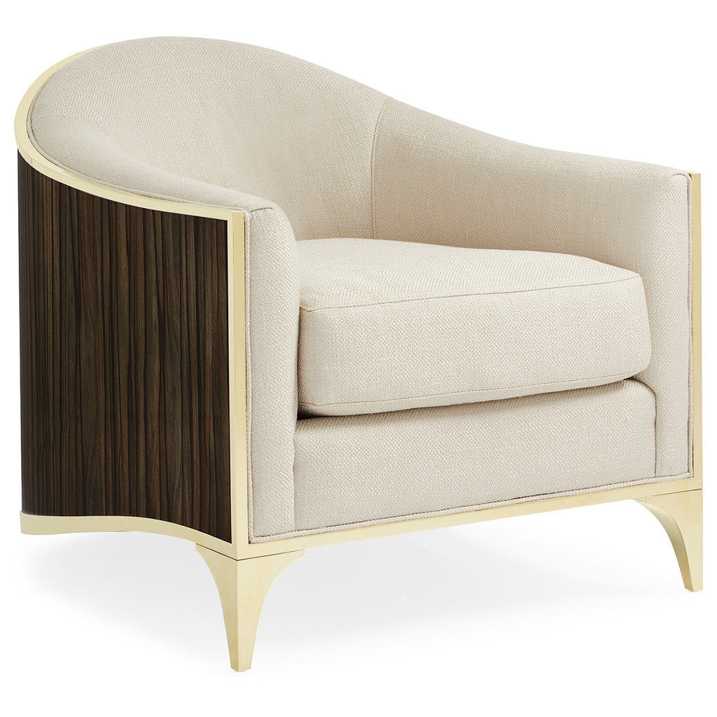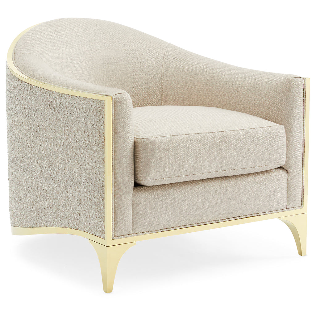 Our elegant Svelte Chair is graceful in every respect and from every angle. Inspired by Italian design in the mid-century, this chair’s extraordinary silhouette is simply breathtaking. This barrel chair is the epitome of refined beauty. Its top rail gently slopes forward while its base gracefully sweeps downward from its sculptural Majestic Gold front legs to balance on the floor in the back of the chair. The chair’s interior and loose seat cushion feature a shimmering basketweave fabric in a lovely Moonstone hue while the chair’s exterior is meticulously upholstered around its barrel back in a tone-on-tone novelty eyelash embroidery. The exposed gold frame wraps the chair in just the right touch of brilliance. Try grouping four or more chairs around a circular cocktail table in a small den, or library for the perfect conversation area.