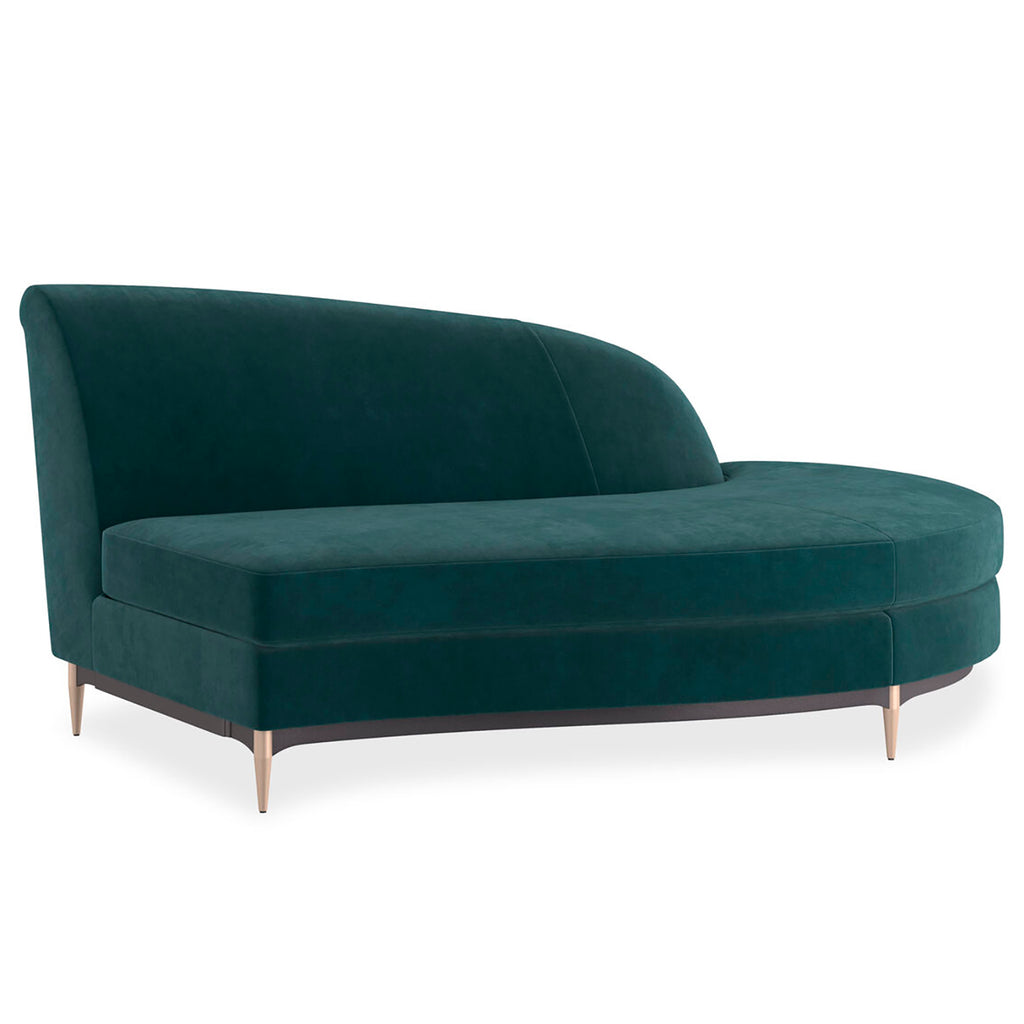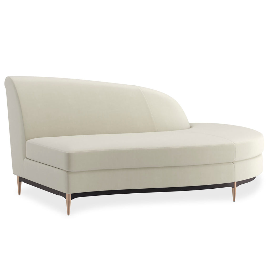 This regal sectional makes a dramatic showpiece that emanates glamour. Upholstered in a velvet, its curved profile is complemented by sumptuous comfort. Its lower edge and outer arms are trimmed in Almost Black while its metal tapered feet are finished in Champagne Gold. Artful from edge to edge, this statement piece creates drama wherever it goes.