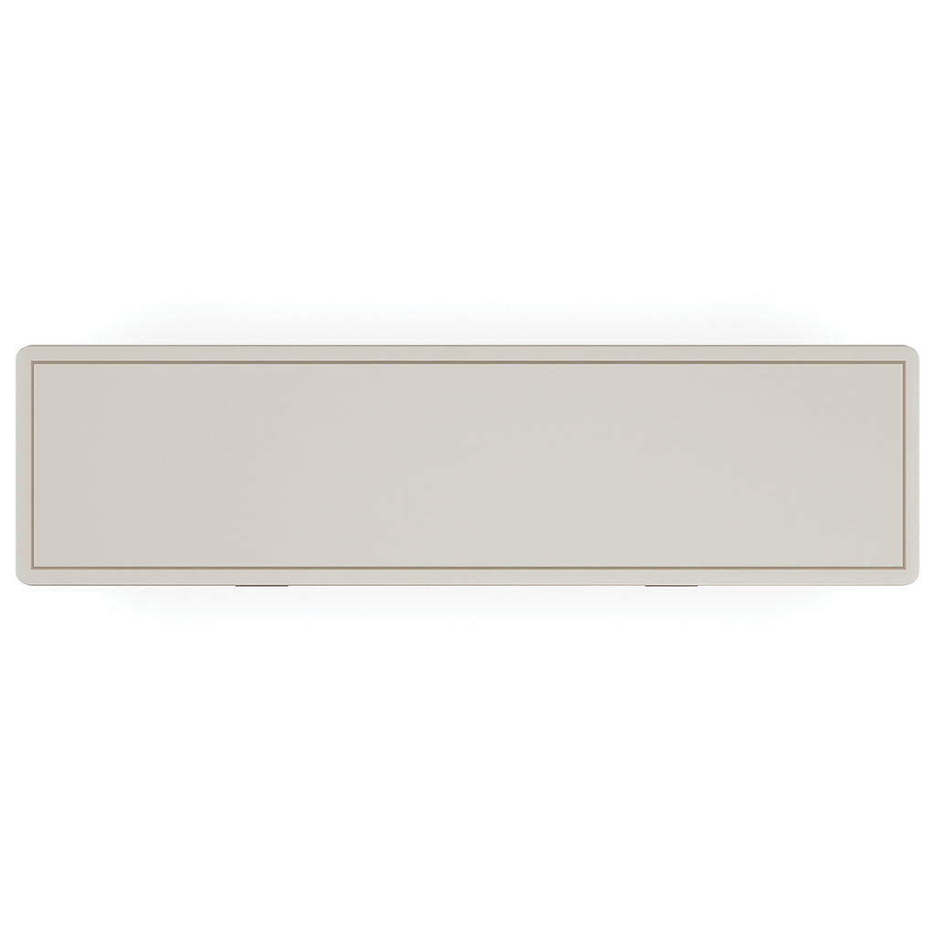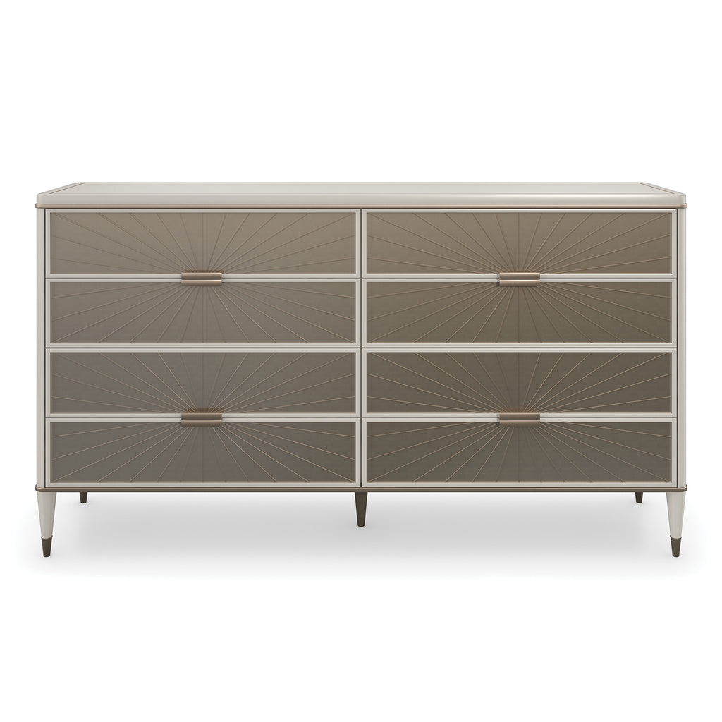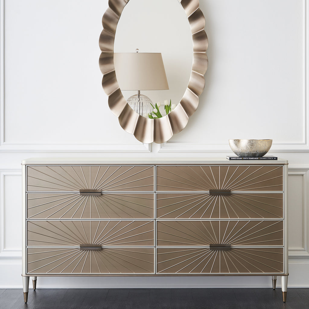 Mirror-like drawer fronts introduce a warmly reflective aesthetic, created from v-groove cut, back-painted glass in a striking radial pattern. A silkscreened pinstripe detail frames the top and adds a touch of luxe, complemented by tapered legs dressed in Bronze Gold ferrules. Eight soft-close drawers offer tucked away storage, with Linen-painted interiors to coordinate with its Matte Pearl frame.