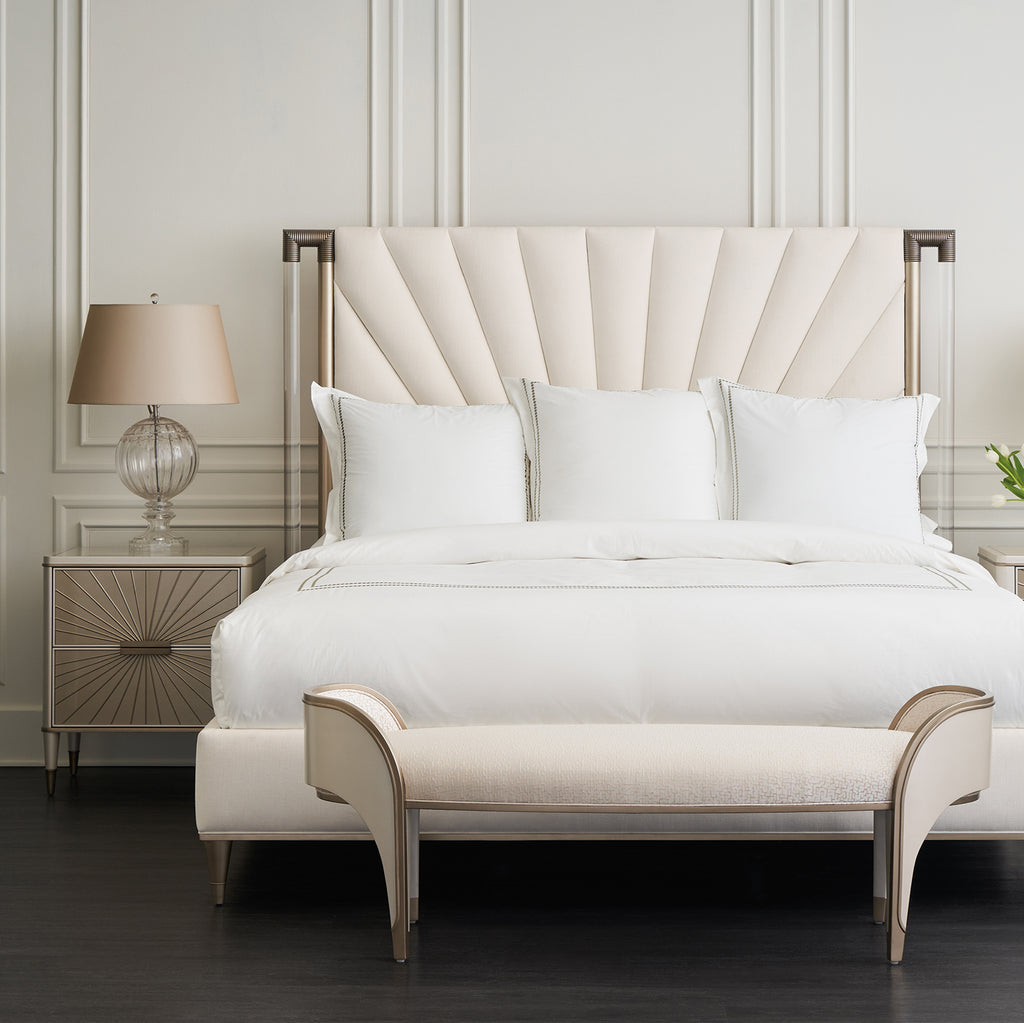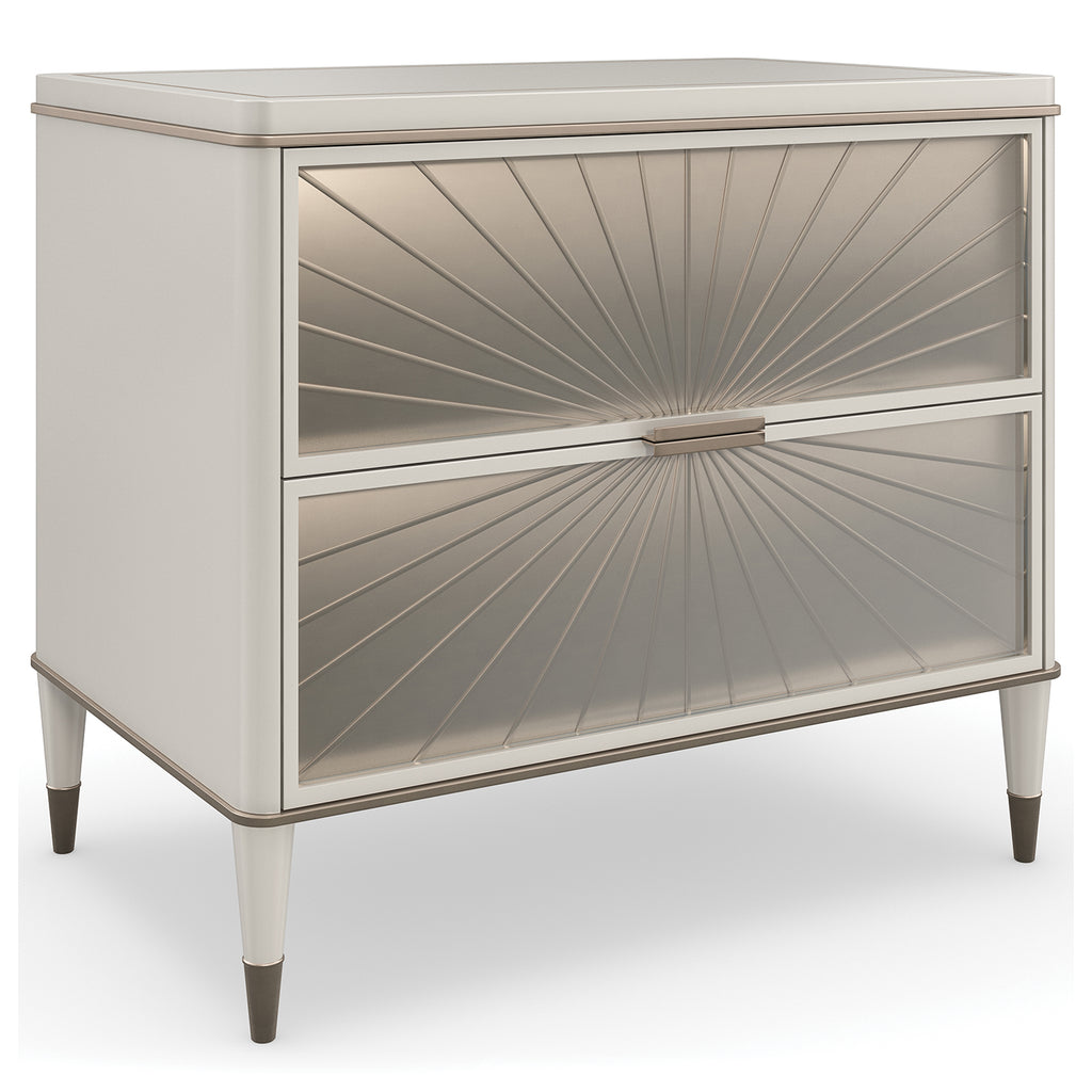 Warmly reflective, the Valentina small nightstand makes an alluring bedside companion in a shimmering mix of materials and finishes. Its mirror-like drawer fronts are created from v-groove cut, back-painted glass to create a striking radial pattern. A silkscreened pinstripe detail frames the top and adds a touch of luxe, complemented by tapered legs dressed in Bronze Gold metal ferrules. A USB port along the back allows for discreetly charging media.