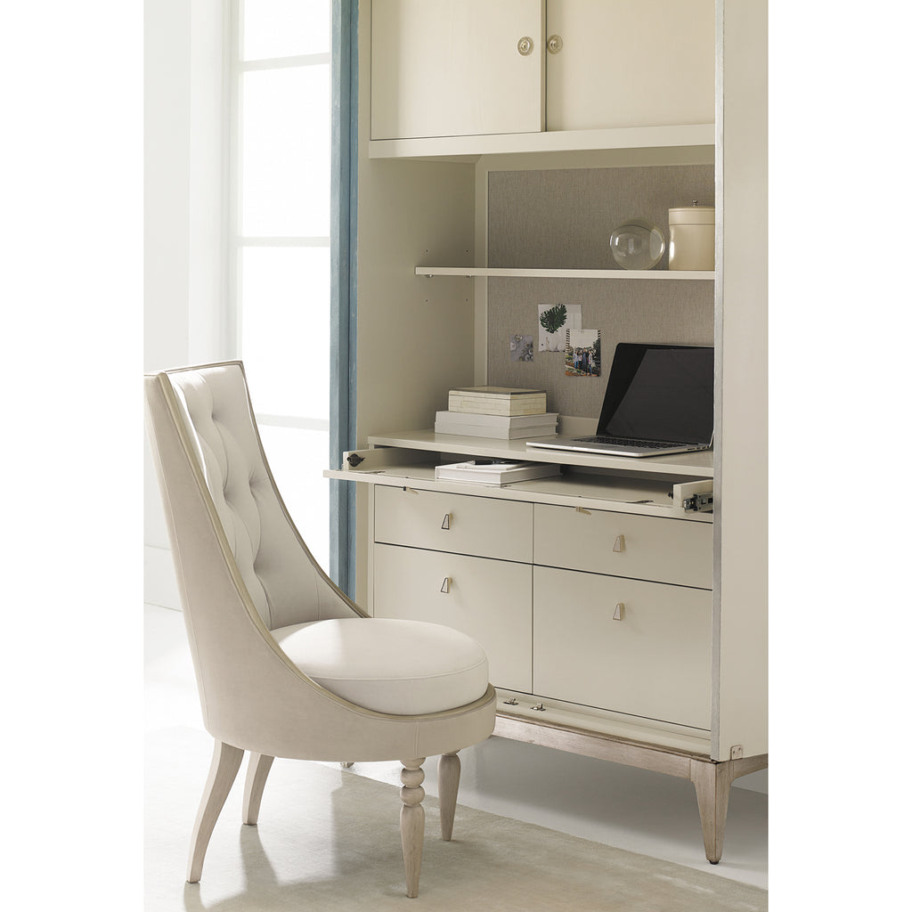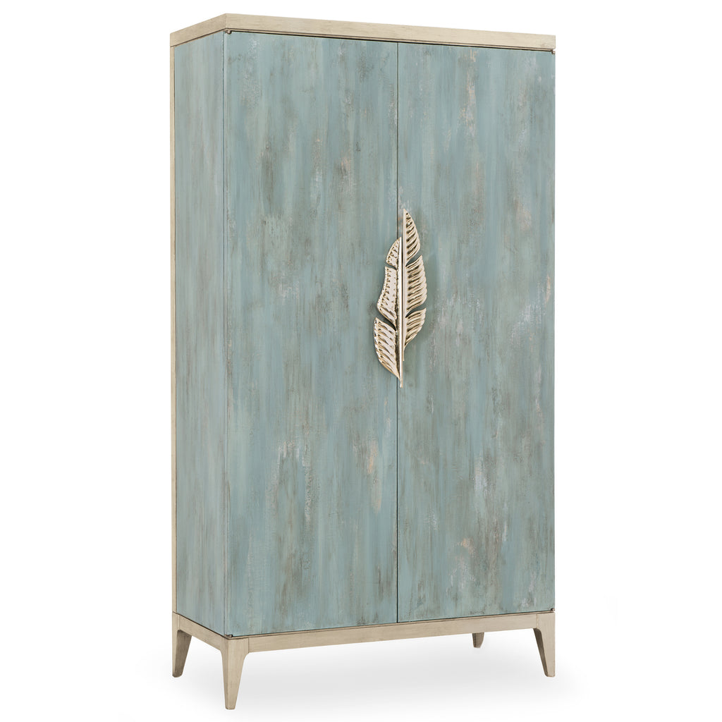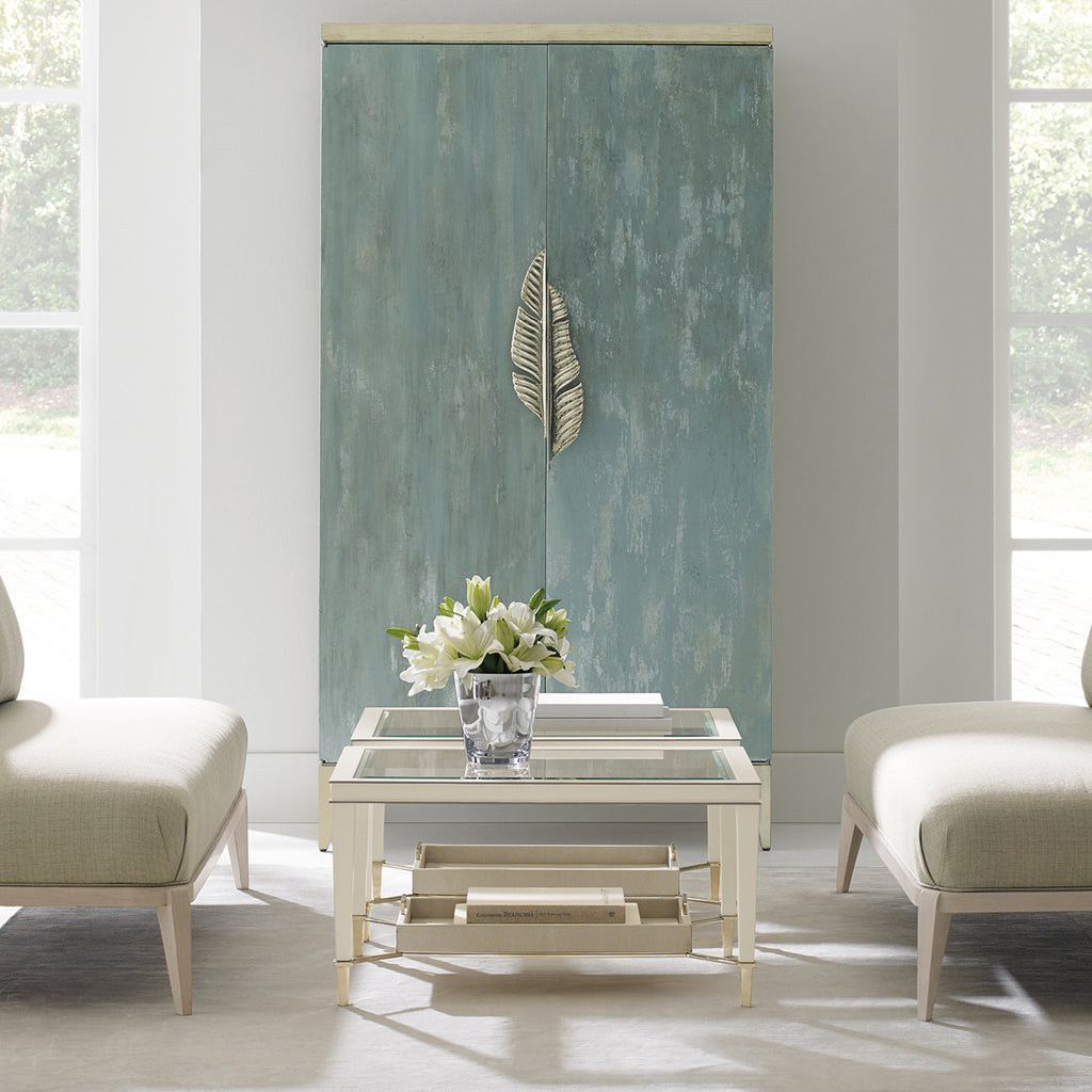 A piece of art is not always found on a canvas. Our custom-painted Watercolours cabinet is a piece of art that also solves a variety of functions in your home. Distinguished by its impressionistic Tranquil finish in greyish blue/aqua that has been kissed with silver leaf, it will literally shimmer in any room. In true Caracole style, our custom-designed, asymmetrical, metallic palm frond door pulls enhance this piece of art. Watercolours is sized to hold a 42-inch television. Additional features include a pull-out writing surface with cord access, two adjustable shelves behind sliding doors, as well as two drawers and two file drawers. Finished with a warm Coastal Silver Leaf plate cap and base, this piece functions as an office, entertainment center or bar with equal fluidity.