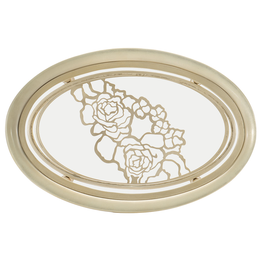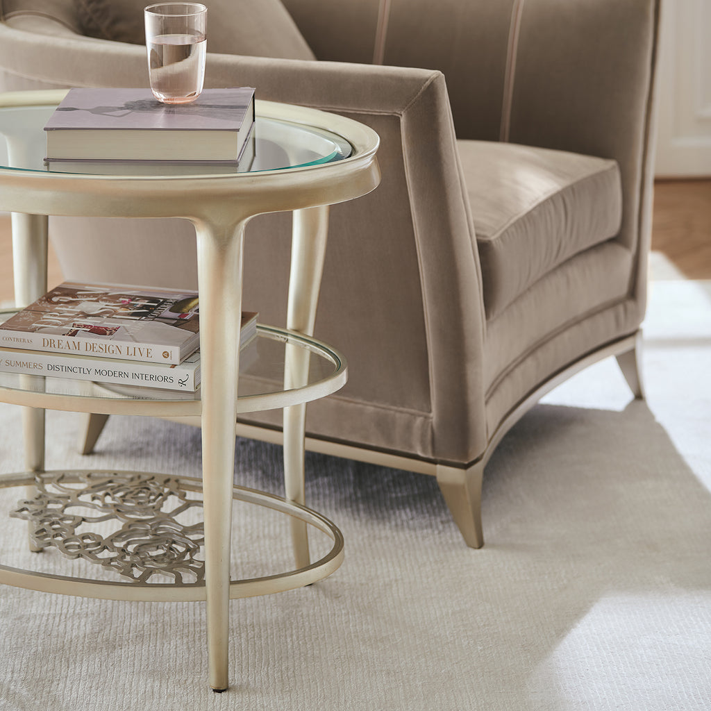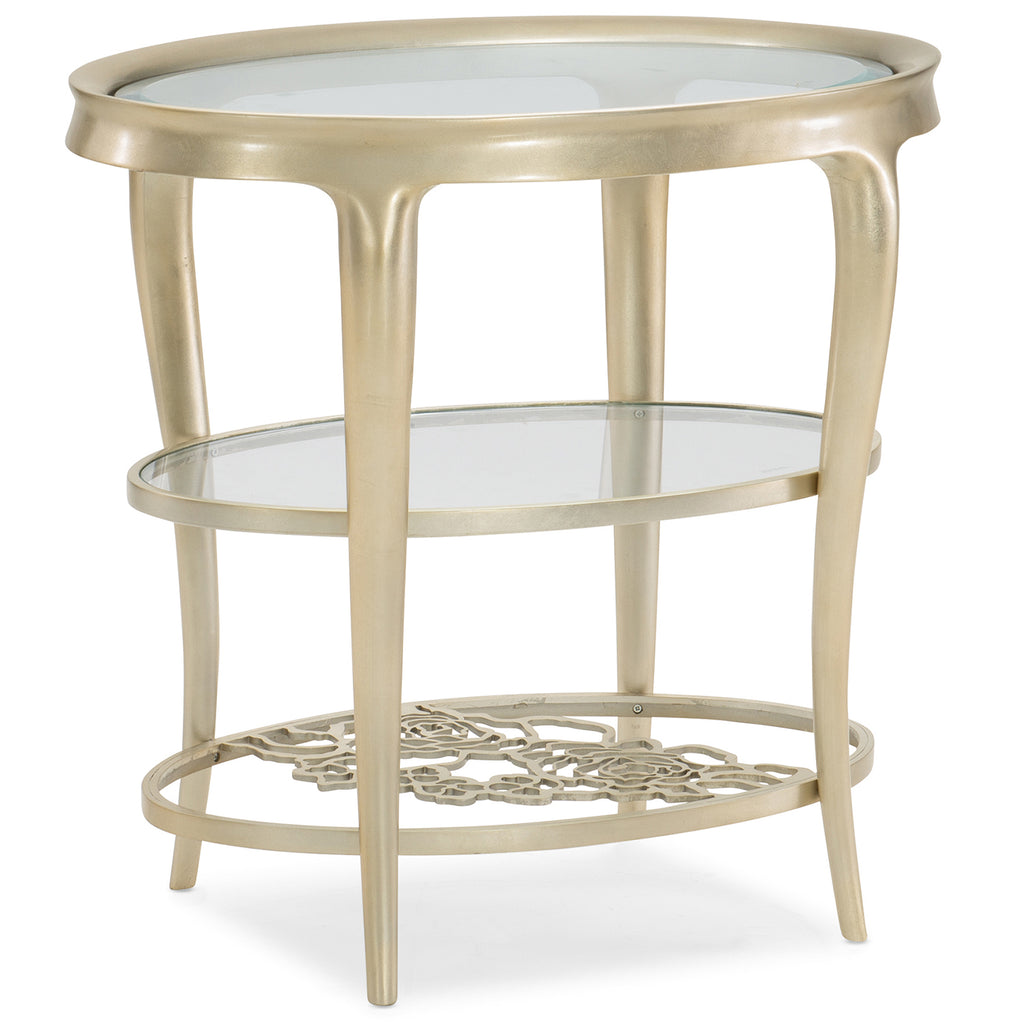 With three levels of luxury culminating in an artful visual, the Wild Flower makes a statement in any space. Gorgeous on every level, it features an oval metal frame enclosing a tempered-glass top as well as a second shelf below. Look all the way through and see the beauty of its third level proudly displaying a metal stretcher cut into a geometric floral pattern. Graceful cabriole legs support its open design and are highlighted with a silver leaf finish in Oracle. Place this lovely table next to your favorite sofa or chair to enjoy its multi-layered beauty