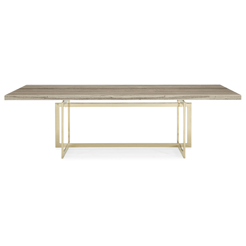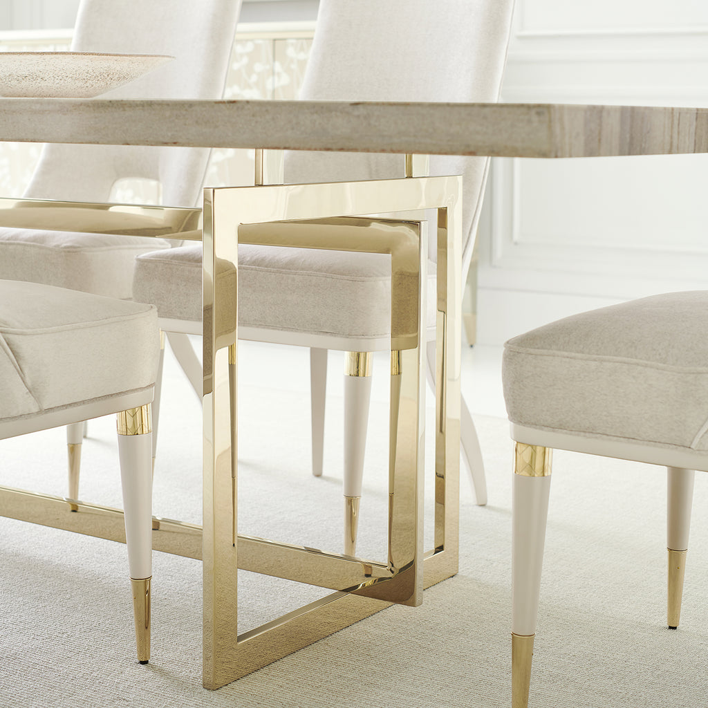 Because not all dining rooms are created equal, there’s the Wish You Were Here table. An extraordinary example of organic luxe, it offers an ultra-impressive 100-inch tabletop of gray sandstone. Earthy tones meld with greiges and soft grays to create a visual that’s sleek and modern while still feeling warm and natural. A bold, open geometric base finished in Whisper of Gold creates a mix of materials and brings in the glamour. With a dining room table this stunning, you’ll hesitate to cover it!