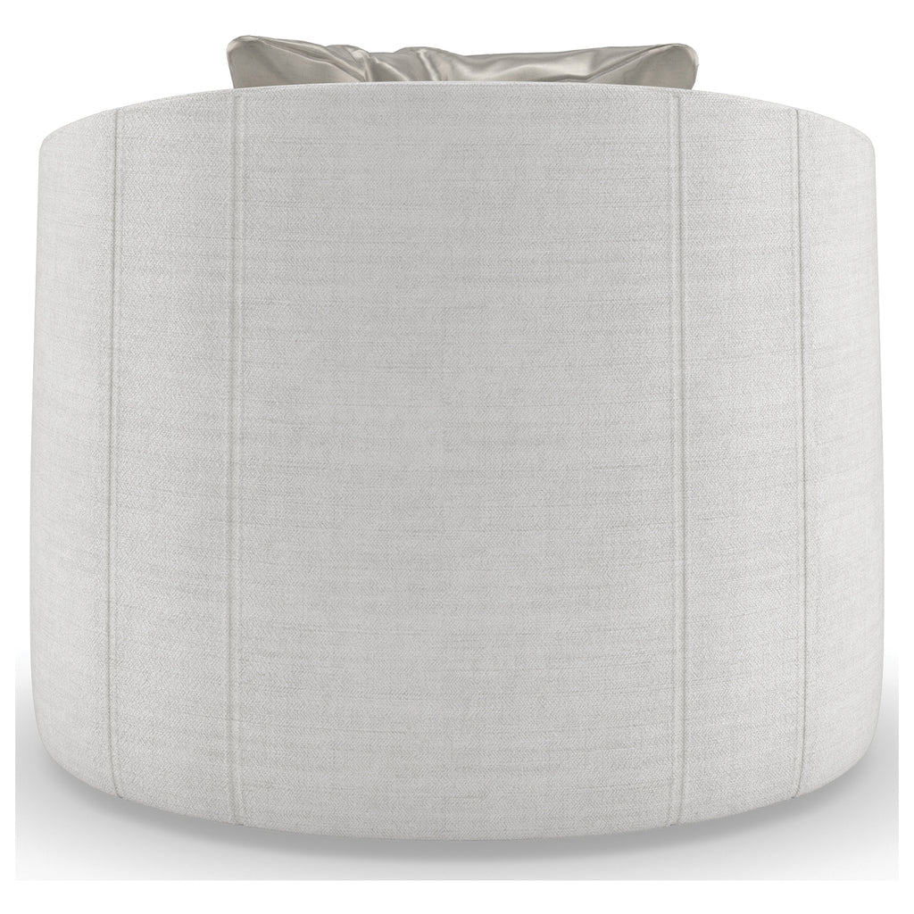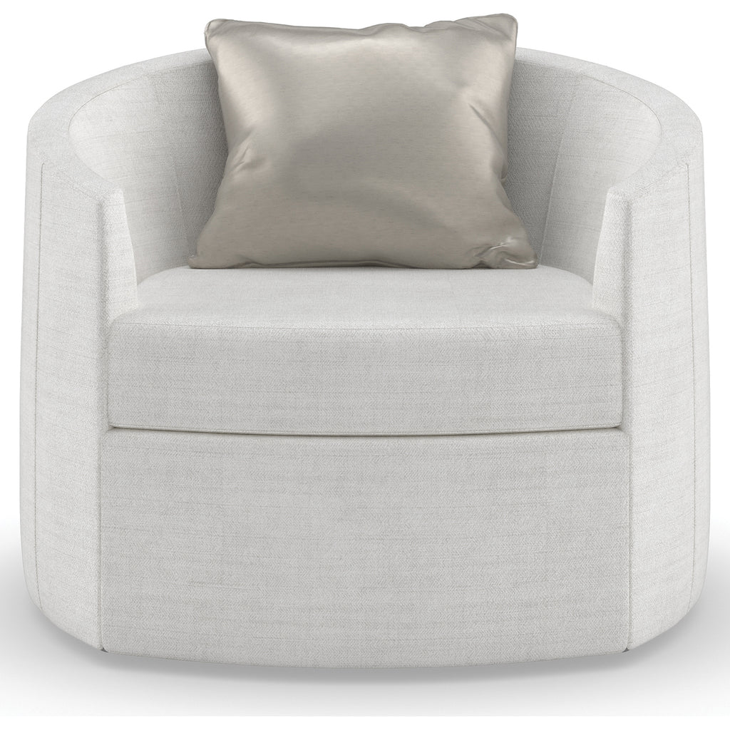 Pleated seams add a subtly sophisticated detail to this softly rounded swivel chair, finely tailored in an easy-care chenille performance fabric. An elevating addition to any seating area, its gracefully curved silhouette appears to float atop a recessed plinth base in an Almost Black finish. A feather down pillow in shimmering satin adds a luxe finishing touch.