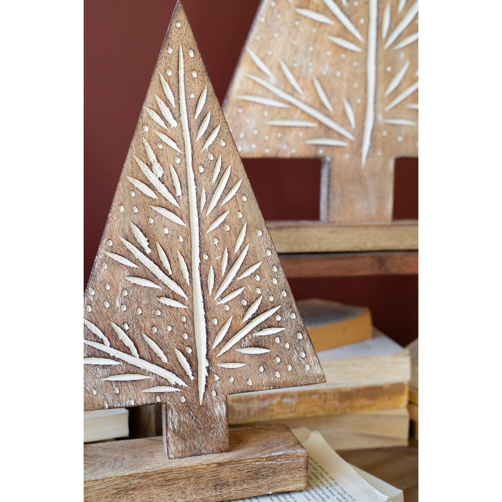 This set of three carved wooden Christmas trees on stands represents simple beauty. Populate your holiday village with these trees. Gift to anyone who needs some cheer.
