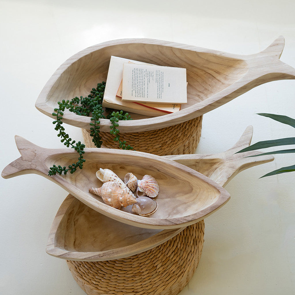 Catch the day's haul on this set of three carved wooden fish platters. You can set the sideboard for the whole family or use these fishy platters for decor display at your seaside or lakeside getaway. These fish platters are neutral enough to suit any decor style.