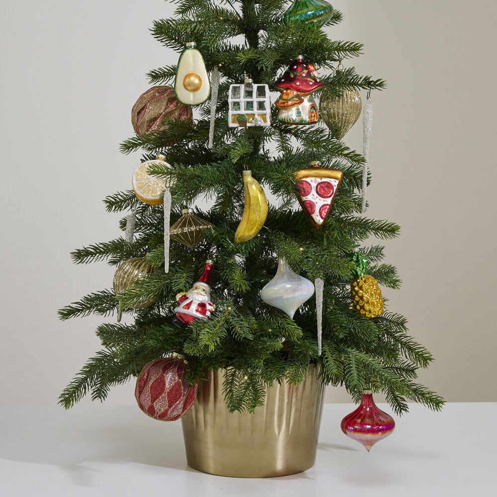 Dress up drop in poinsettias and seasonal trees with the Delicata Pot, a warm gold brushed metal pot with a scalloped detail around the opening. Small pleats stretch halfway down the pot for a bit of texture, while the bottom half has a smooth, clean finish. Gift 8-inch Azalea drop in plants in this versatile, timeless pot, and add a velvet ribbon and bow to make it even more special.