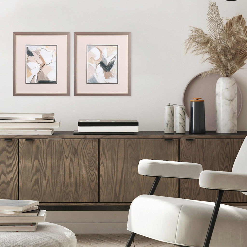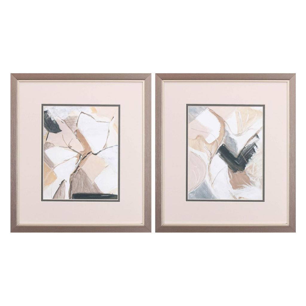 This set of two abstract prints come double matted. They are then framed under glass with a complimenting metallic bronze frame.