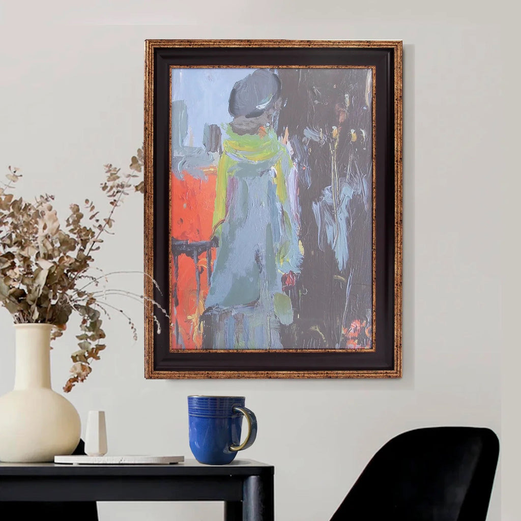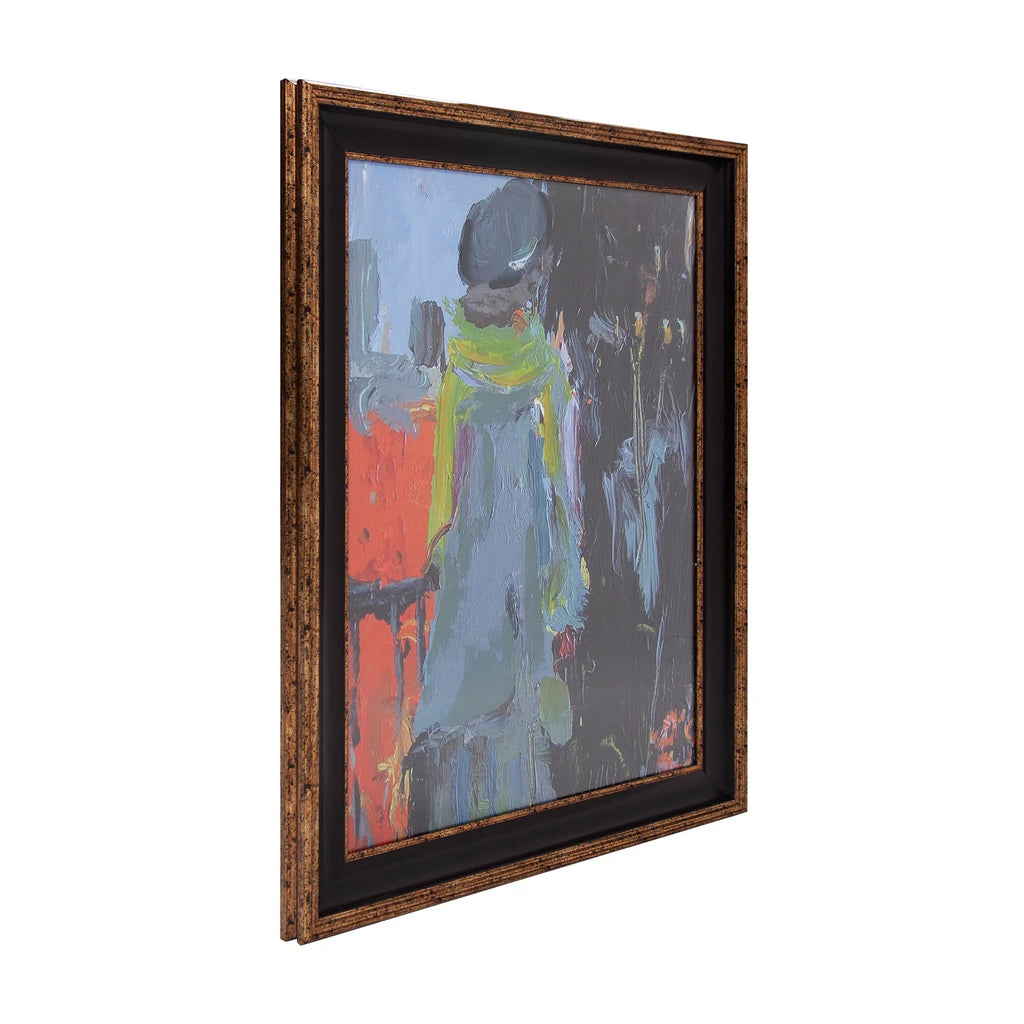As I as walking along a busy avenue one cold rainy gray day, could not help noticing the rather large woven chartreuse scarf that a woman had wrapped around her neck to keep warm. I wondered if that color matched her dress or was just the right color that day to cheer her up. Each of these pieces are embellished by hand with touches of giclee to highlight and add texture to each canvas.