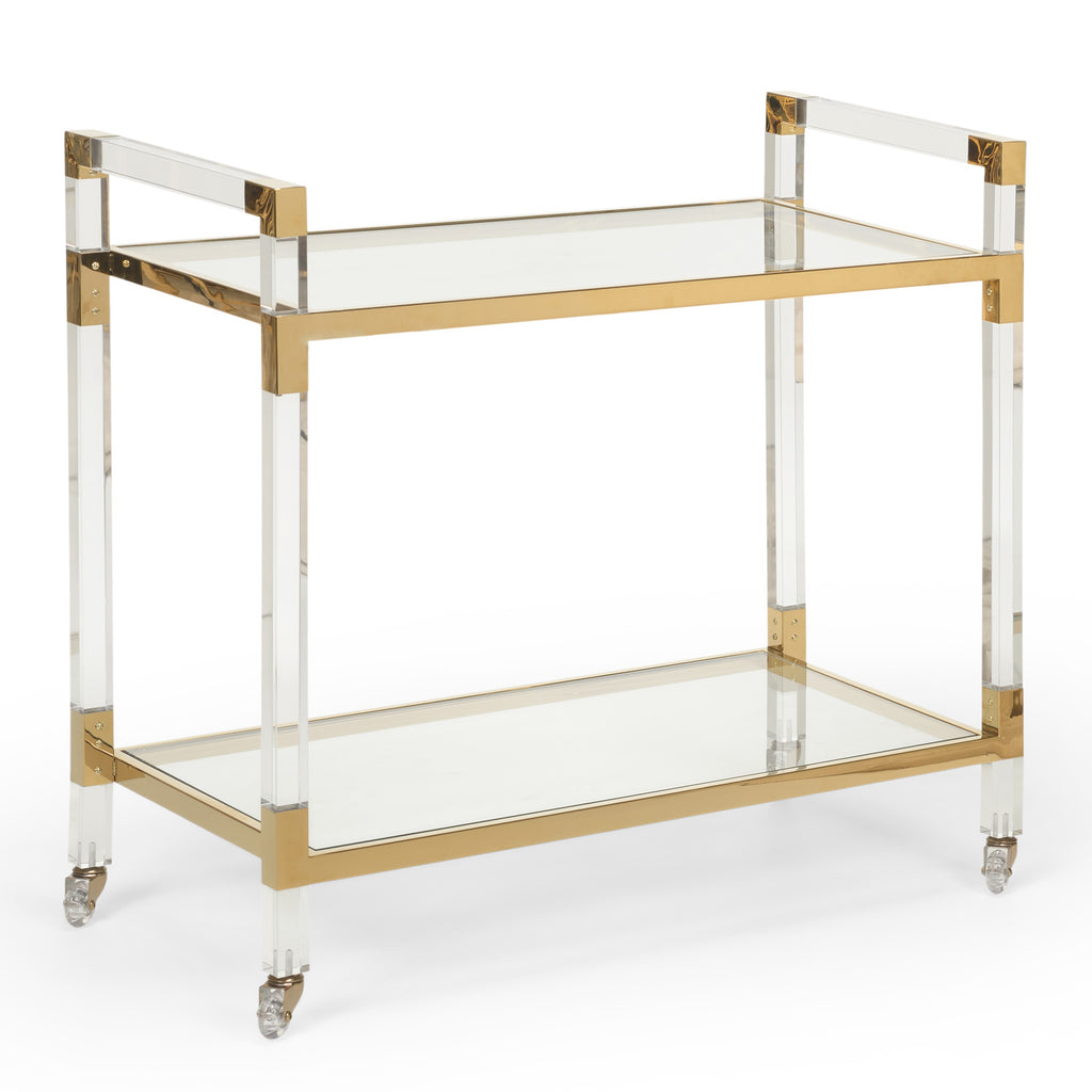 This Chelsea House bar cart entertains guests with modern elegance. Chic and sophisticated, this accent delights in a dining room or living room. Clear acrylic with clear glass shelves and polished brass finished iron edging.