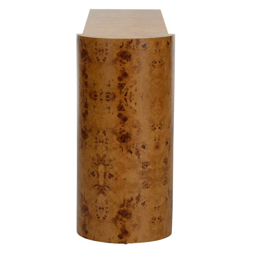 A one-of-a-kind piece, the Carnegie Console Table is a unique shape with a rounded leg and corner on one end and a flat top and leg on the other. Burlwood veneer makes this piece even more special. Designed by Elizabeth Wicker.