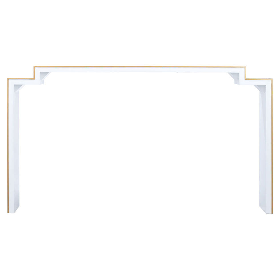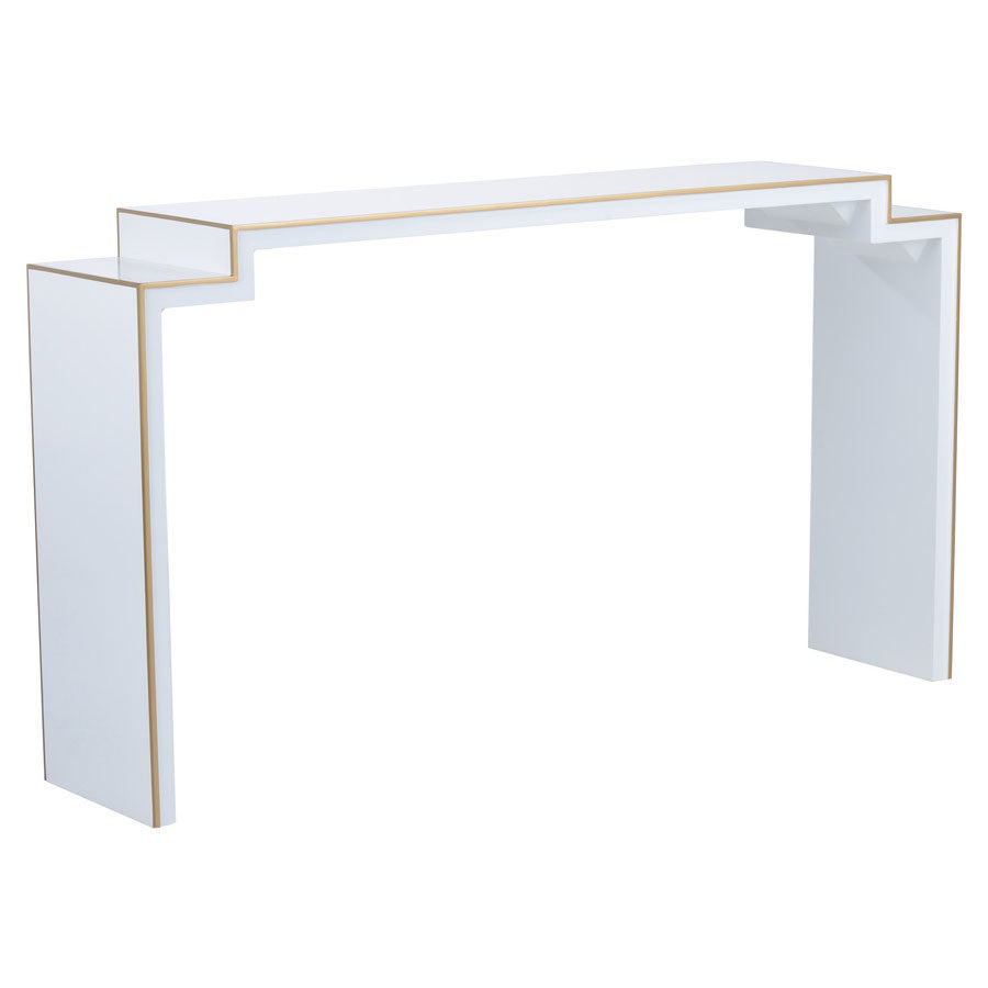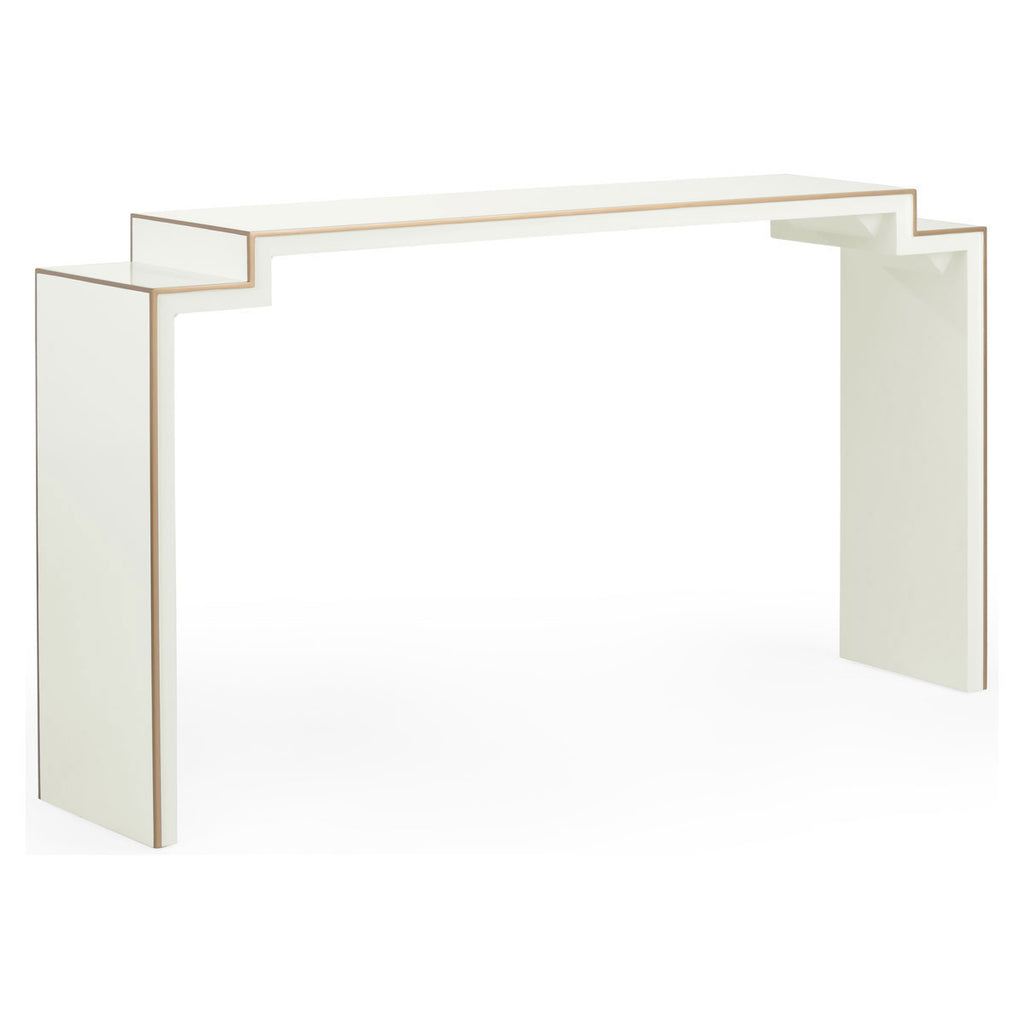 This console table from Chelsea House invites contemporary sophistication to your home. Simple and chic, this piece's sleek silhouette delights with modern elegance. The Chelsea House Chatsworth console table in white or cream is inspired by the very popular Chatsworth cocktail table. Featuring a white or cream lacquer on wood with metallic gold detailing and stepdown design, designed by Elizabeth Wicker.