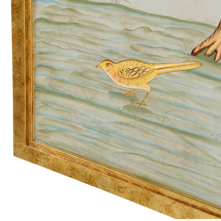Wooden panel with hand painted chinoiserie scene framed in gold molding.