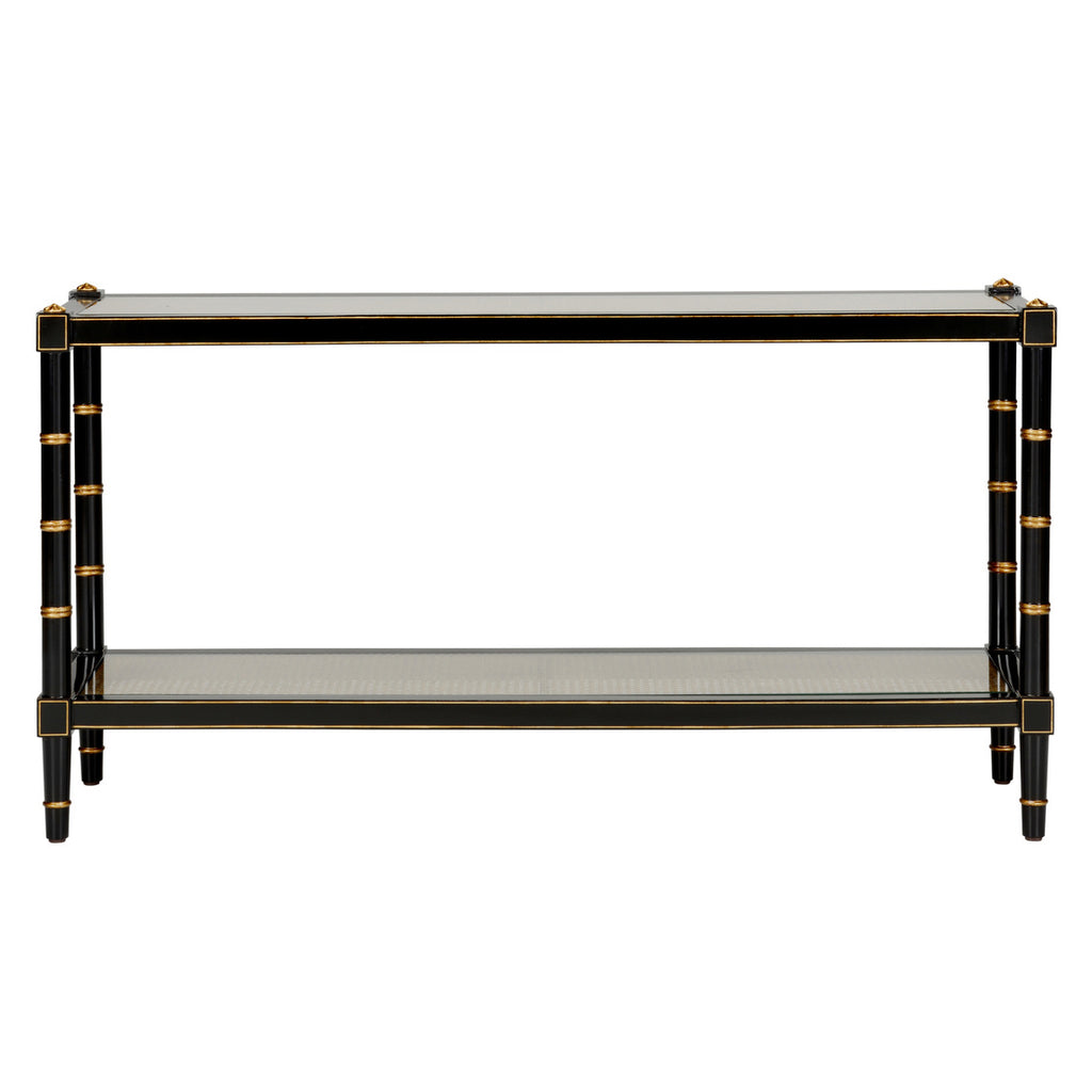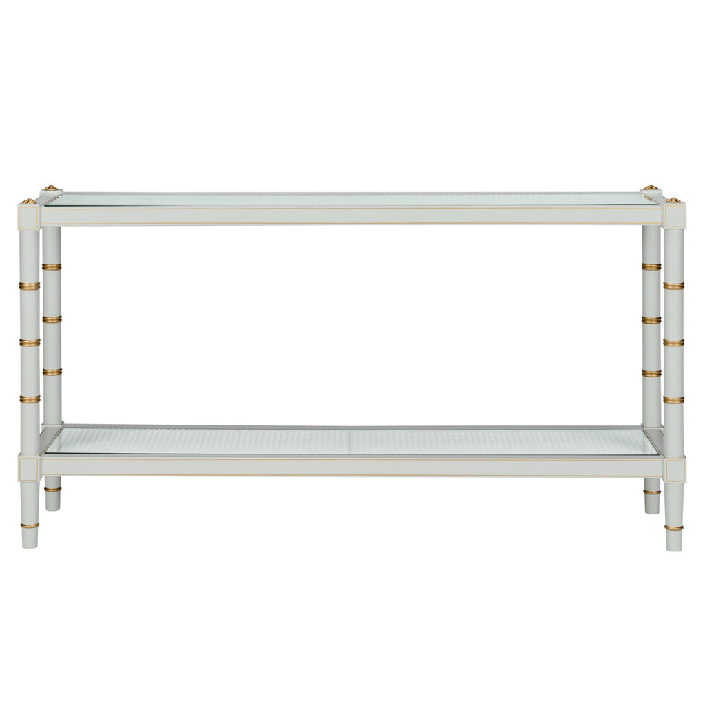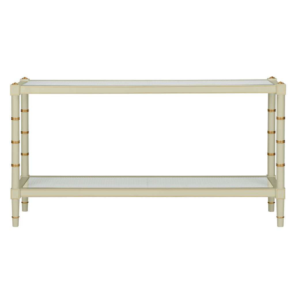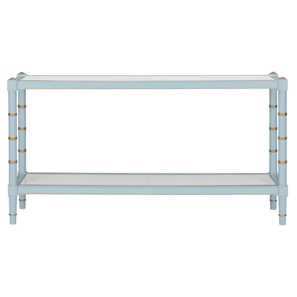 The Connor Console Table is adorned with gold hand-painted detailing around the edge of the bamboo-inspired legs and natural caned shelf. Perfect for any room that needs a pop of color. Designed by Bill Cain.