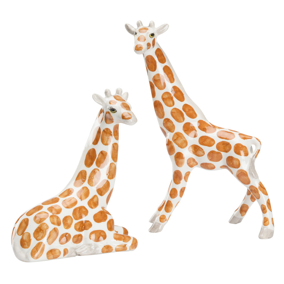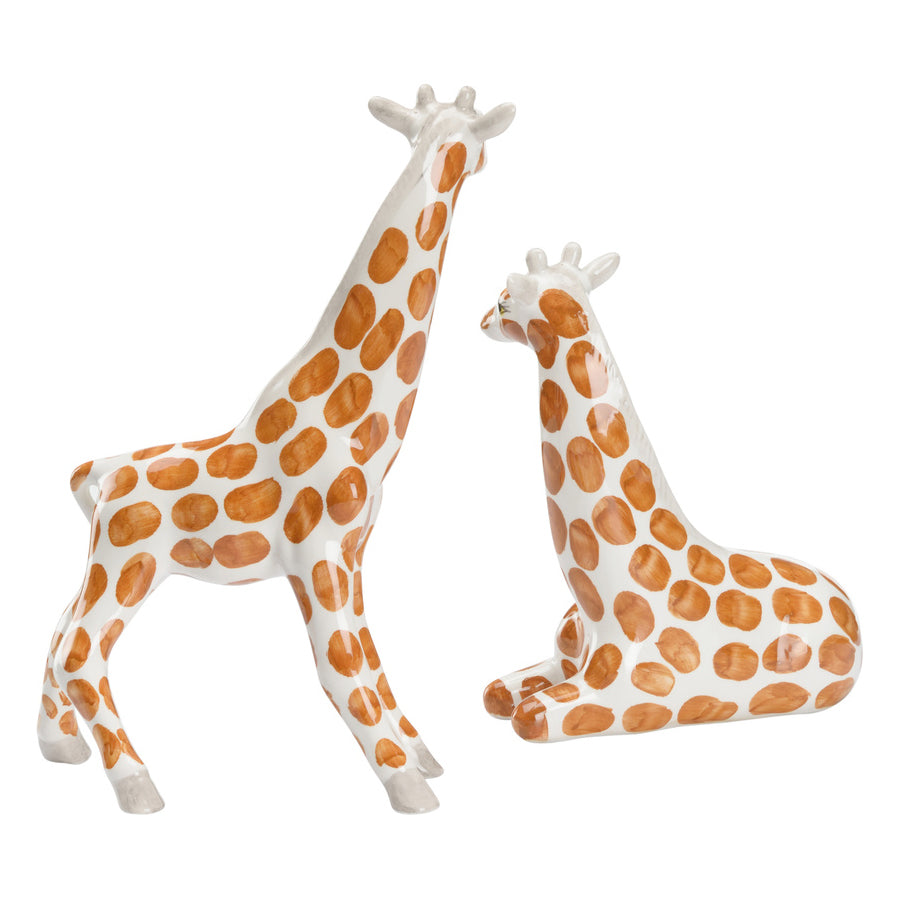 This playful pair of giraffes in hand painted Italian glazed ceramic are deal for display on tabletops or shelves.