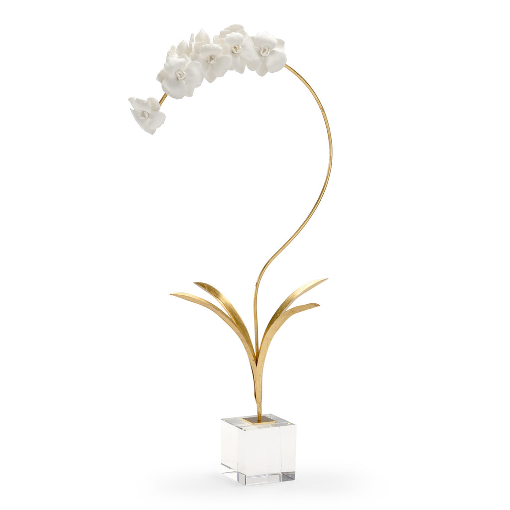 Chelsea House decorates the home with this gorgeous object. A sophisticated conversational piece, place this accent atop a coffee table or mantle to catch the eye. White ceramic orchid on antique gold painted iron stem mounted on clear crystal.