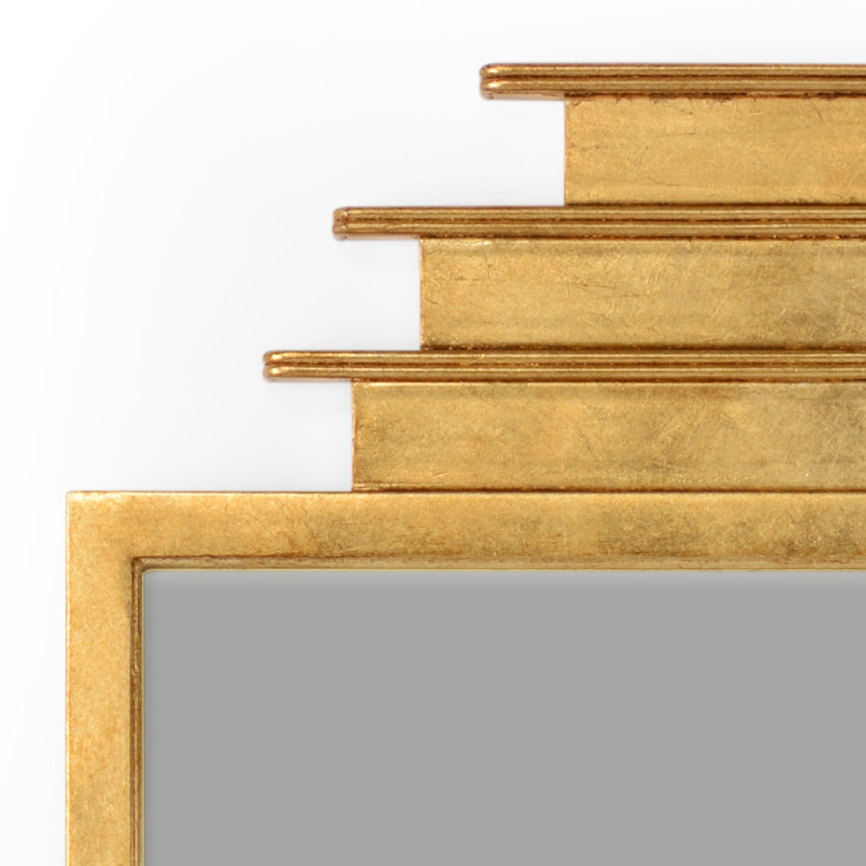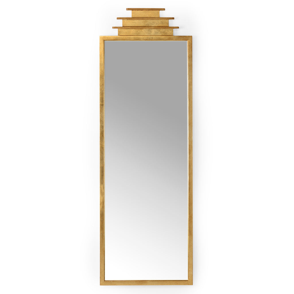 Chelsea House's wall mirror makes a bold, modern statement in a bedroom, hallway or dining room. Effortlessly glamorous, this grandiose accent can't help but catch the eye. The Chelsea House Temple wall mirror in Gold Leaf on metal framed with a pagoda inspired top.