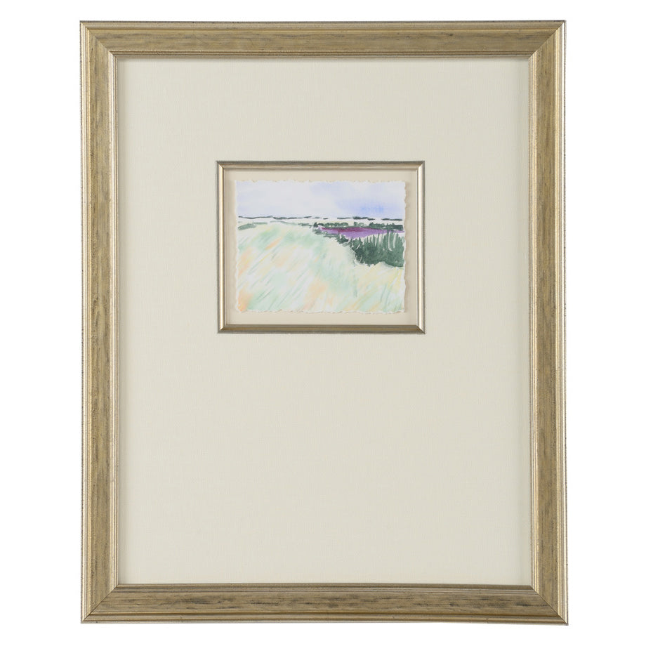 Silver leaf frame with fillet and linen mat. Framed in glass.