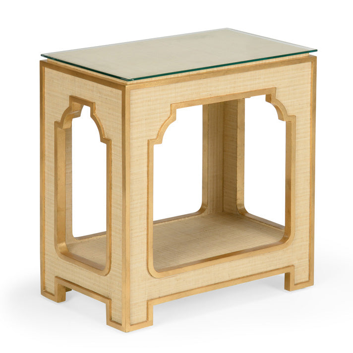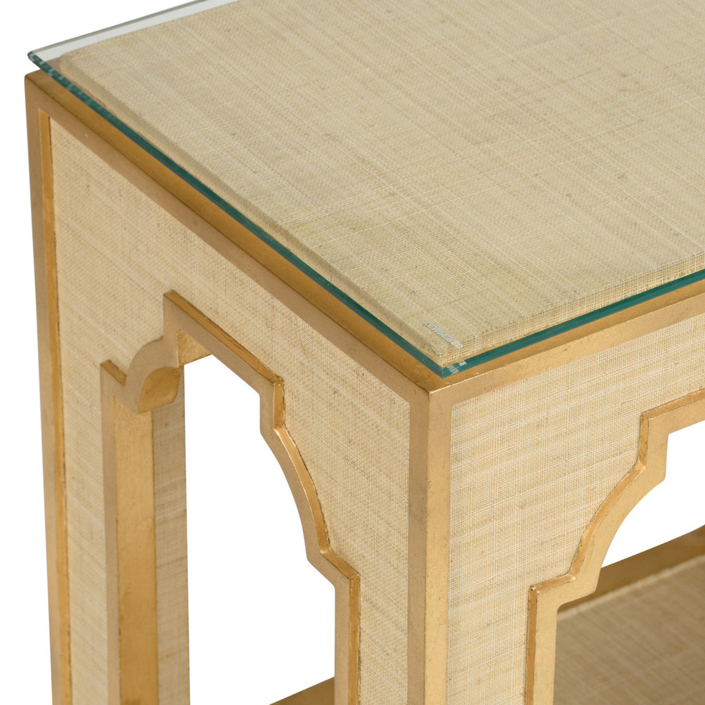 This table from Chelsea House intrigues in a bedroom or living room with contemporary style. Its clean lines express fresh modernity for a captivating statement. The Chelsea House Yangon side table features Cream or Brown colored raffia with Gold Leaf accents and a glass top.
