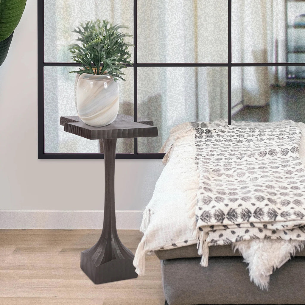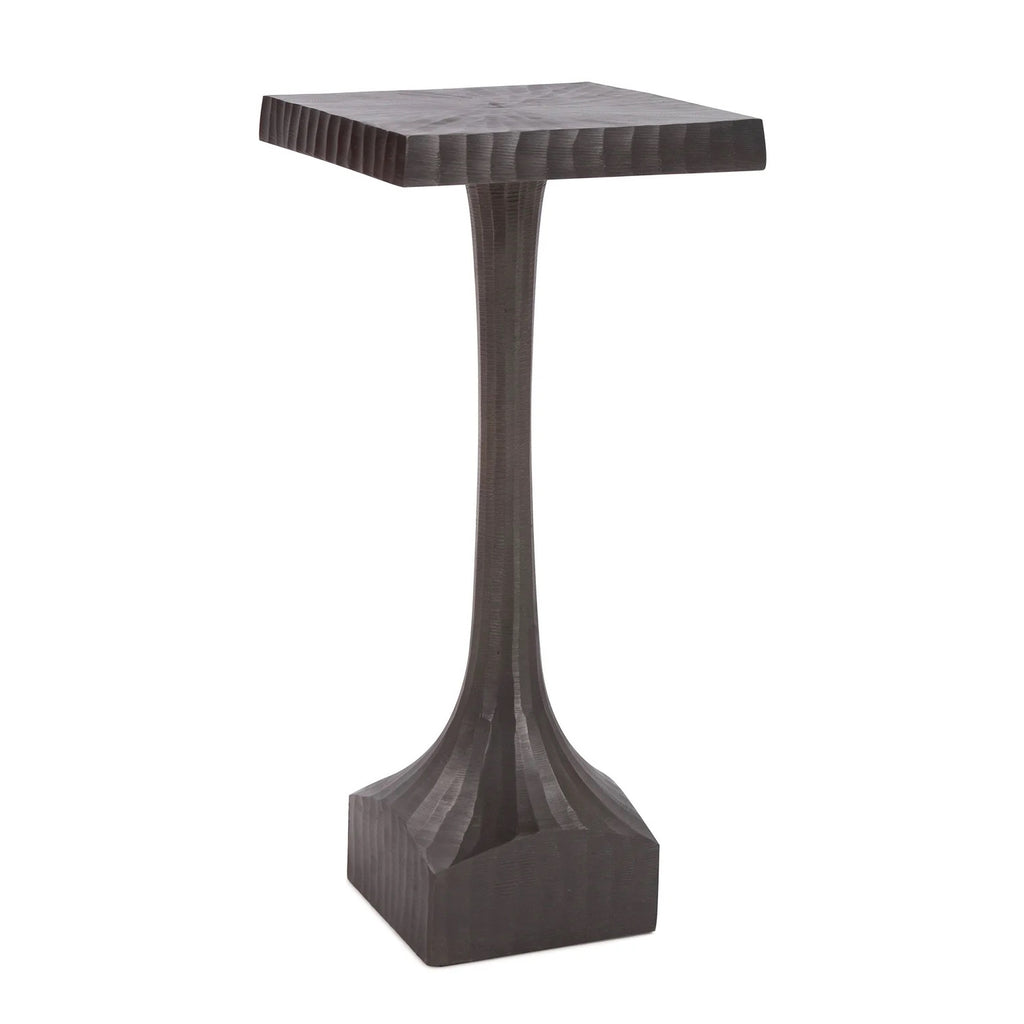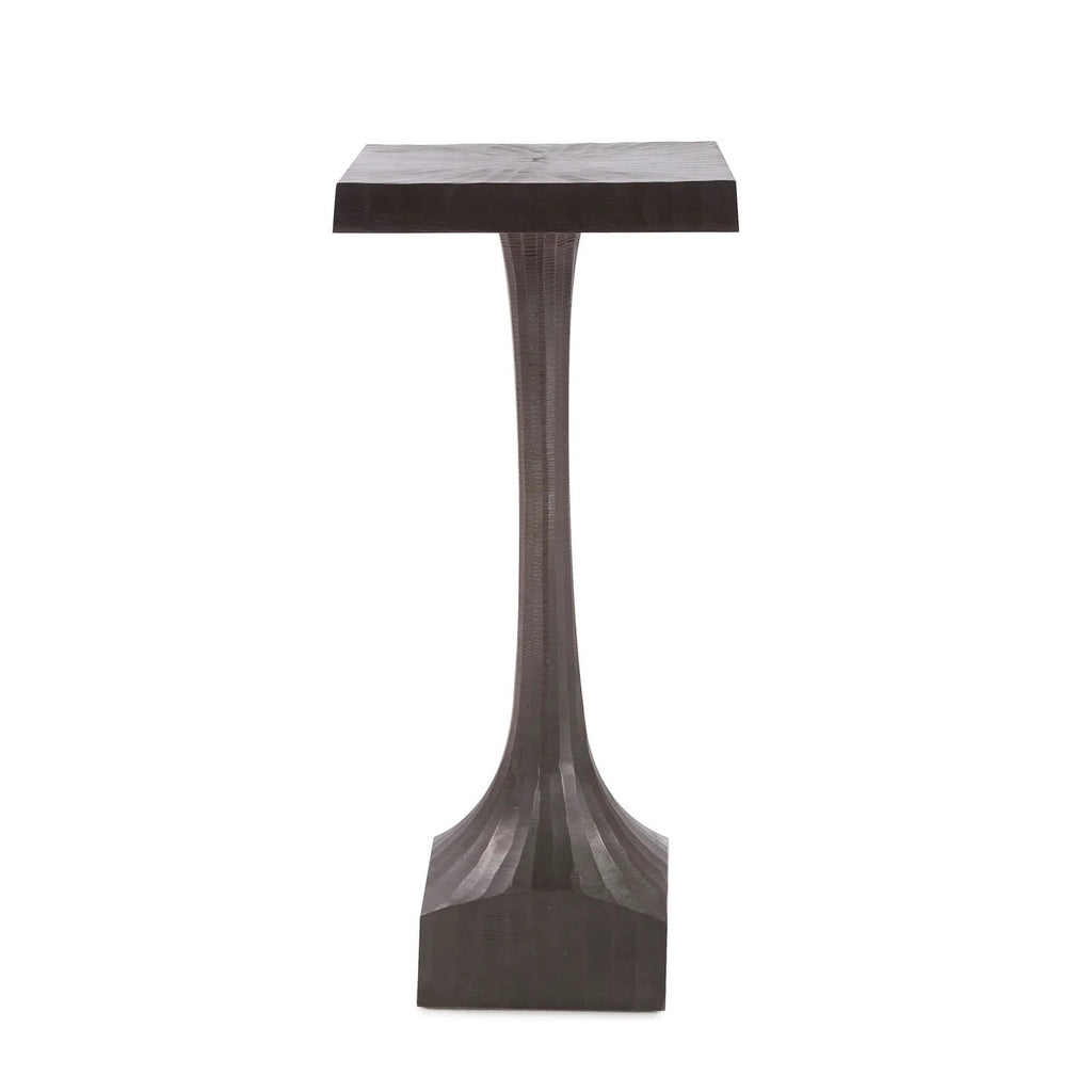 This cast aluminum Martini table will certainly provide the perfect spot to rest your cocktail! The simple frame is fashioned from cast aluminum with a flared base and a square top accentuated by a chiseled textured surface. The texture is further defined by a rich graphite finish. Its small footprint makes it the perfect table for small spaces.