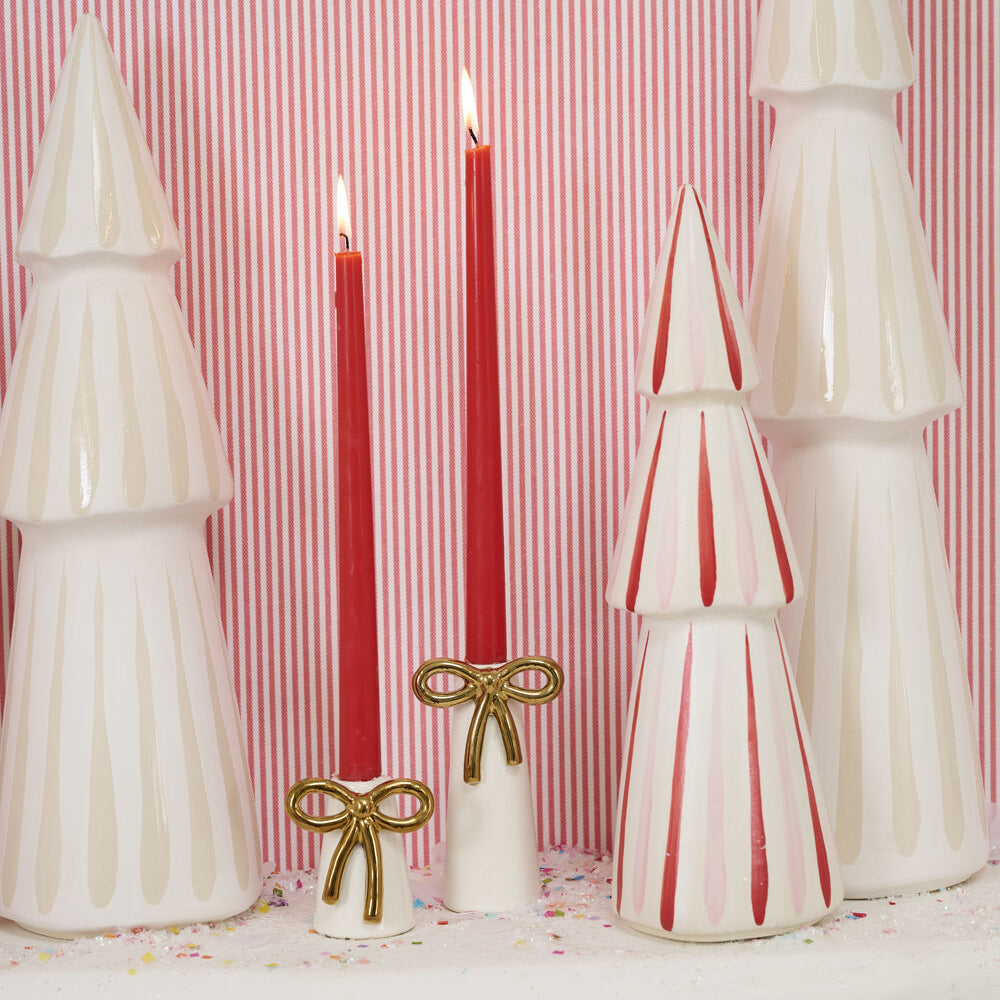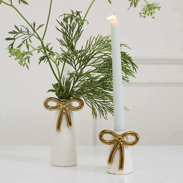 Add a little golden glamor to a holiday display with the Coquette Candleholder, a ceramic taper holder topped with a metallic gold bow! A simple tapered cylinder silhouette in white is a perfect neutral ground for the playful dimensional bow. Style with a colorful candle alongside the budvase for a playful look. The Coquette is a dreamy collection for the holiday season, and is equally perfect for bridal or baby showers, and wedding and events.