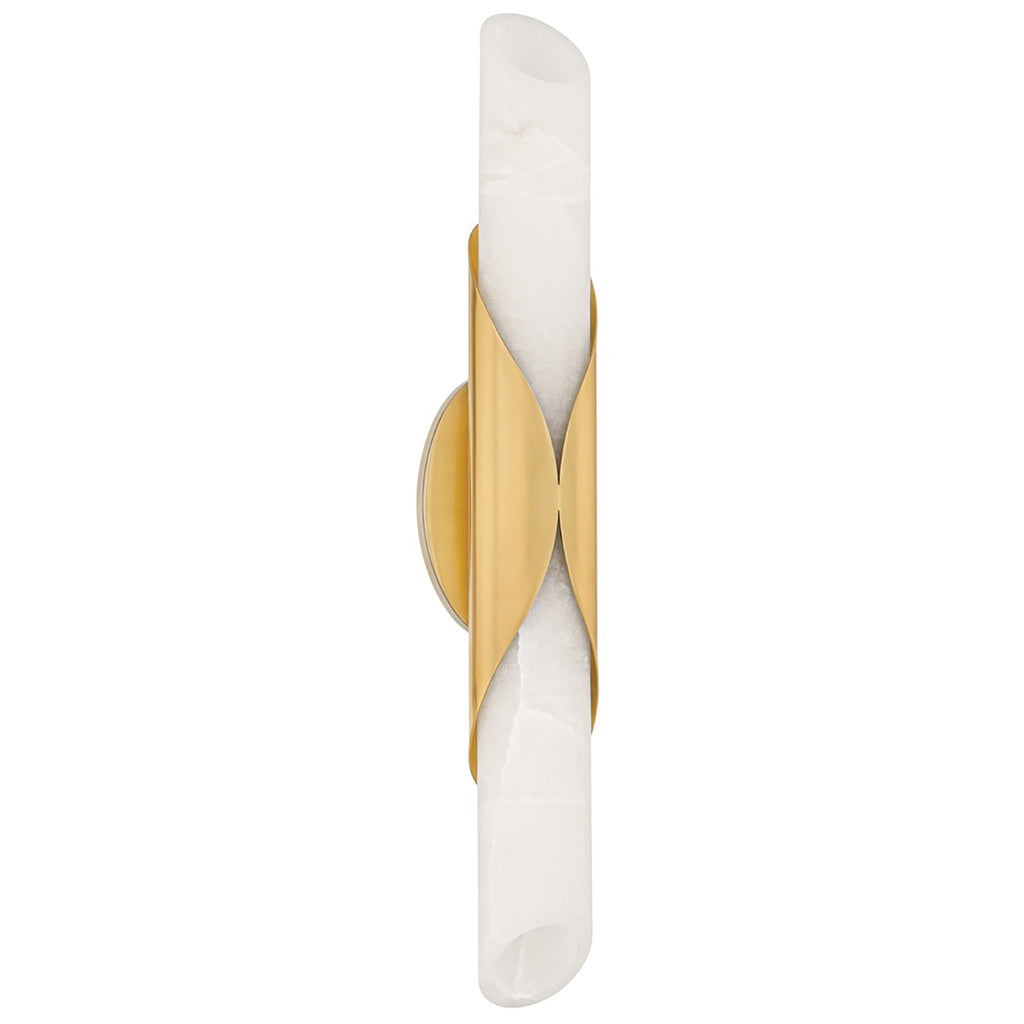 Embodying easy elegance, Corbett Lighting Camilla explores the relationship between natural stone and sleek metal. A translucent alabaster tube is wrapped by timeless Vintage Brass forms that resemble leaves. Paying homage to nature through both materiality and form, this sconce emanates serenity from within.