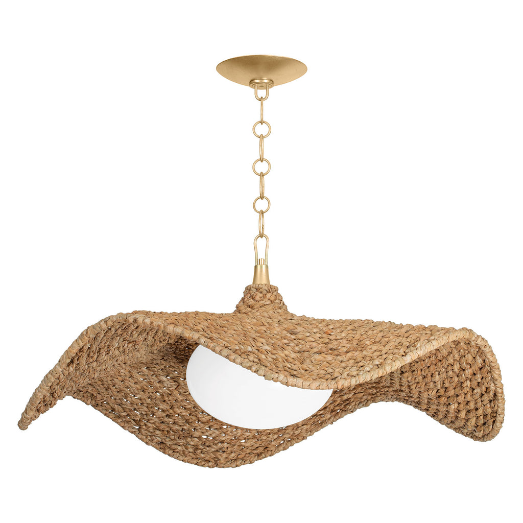 From high-drama statement pieces to subtle glamour, lighting by Corbett delivers the illuminated warmth and refinement your space needs. When your dining room or kitchen island needs a pop of drama, Corbett pendants brighten spaces with a refined look all while suspended from the ceiling. Inspired by the silhouette of an oversized straw hat, Levene features a large Abaca Rope shade over an opal glossy glass globe. The Vintage Gold Leaf metalwork pairs perfectly with the organic vibe of the rope and adds a touch of luxury. The wavy lines of the shade create a sense of motion overhead and bring an airiness to the design.
