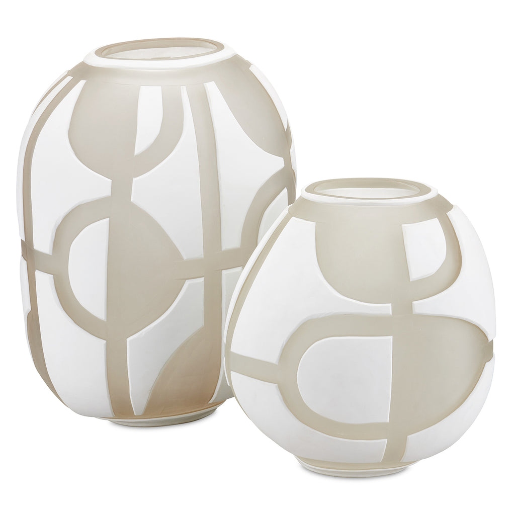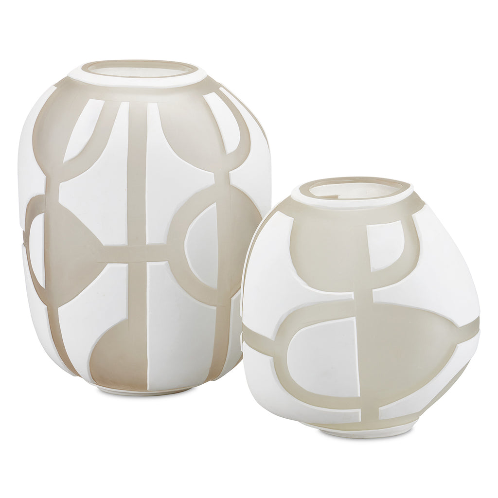 The Currey & Co Art Decortif White Vase Set was realized in the tradition of Venetian glass techniques. Two layers of glass, one white and one clear with a matte surface, are hand-cut so that portions of the white glass are removed to create the geometric pattern that is reminiscent of the era for which the vases are named. This is a complex process that makes these true artisanal pieces.