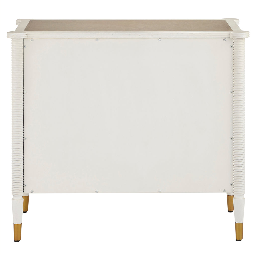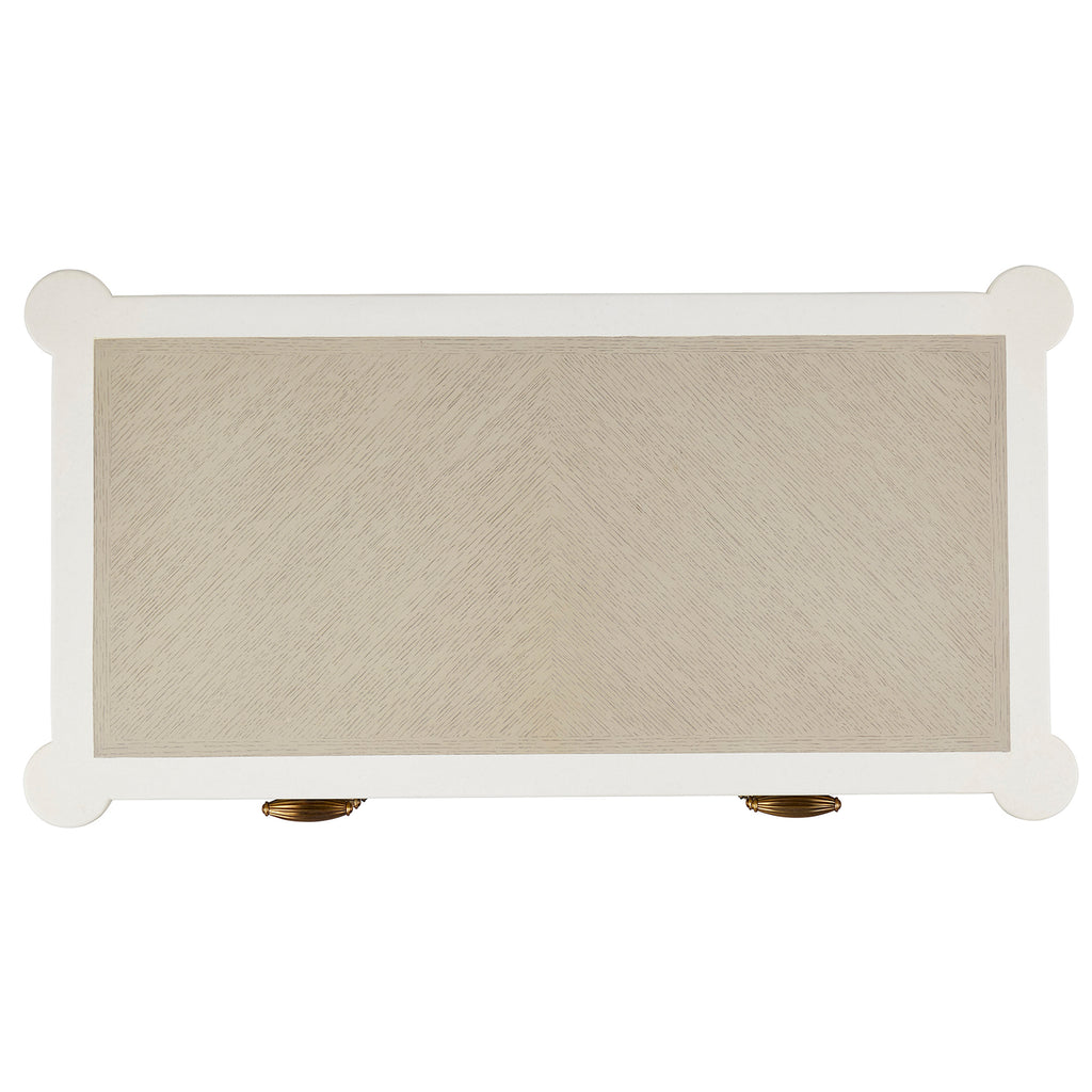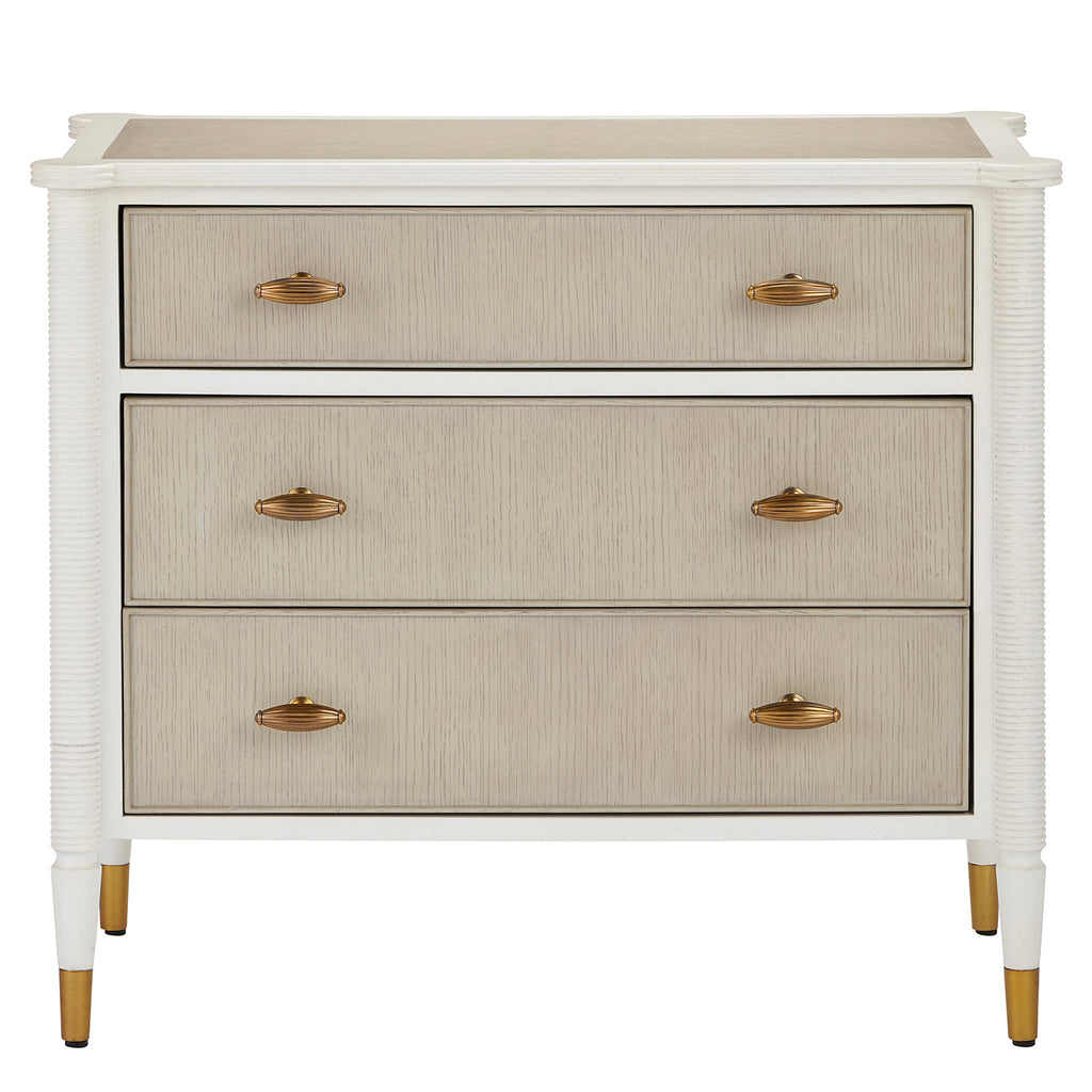 Made of mahogany and oak in a mix of off-white and fog finishes, the Aster Three-Drawer Chest was inspired by an antique from the Winterthur Museum. The gray and white chest has three drawers on which the polished brass pulls are warm accents. Part of the Winterthur Collection, the chest has turned legs that are capped by ferrules to match the finish on the pulls. Each drawer is fitted with removable drawer liners.